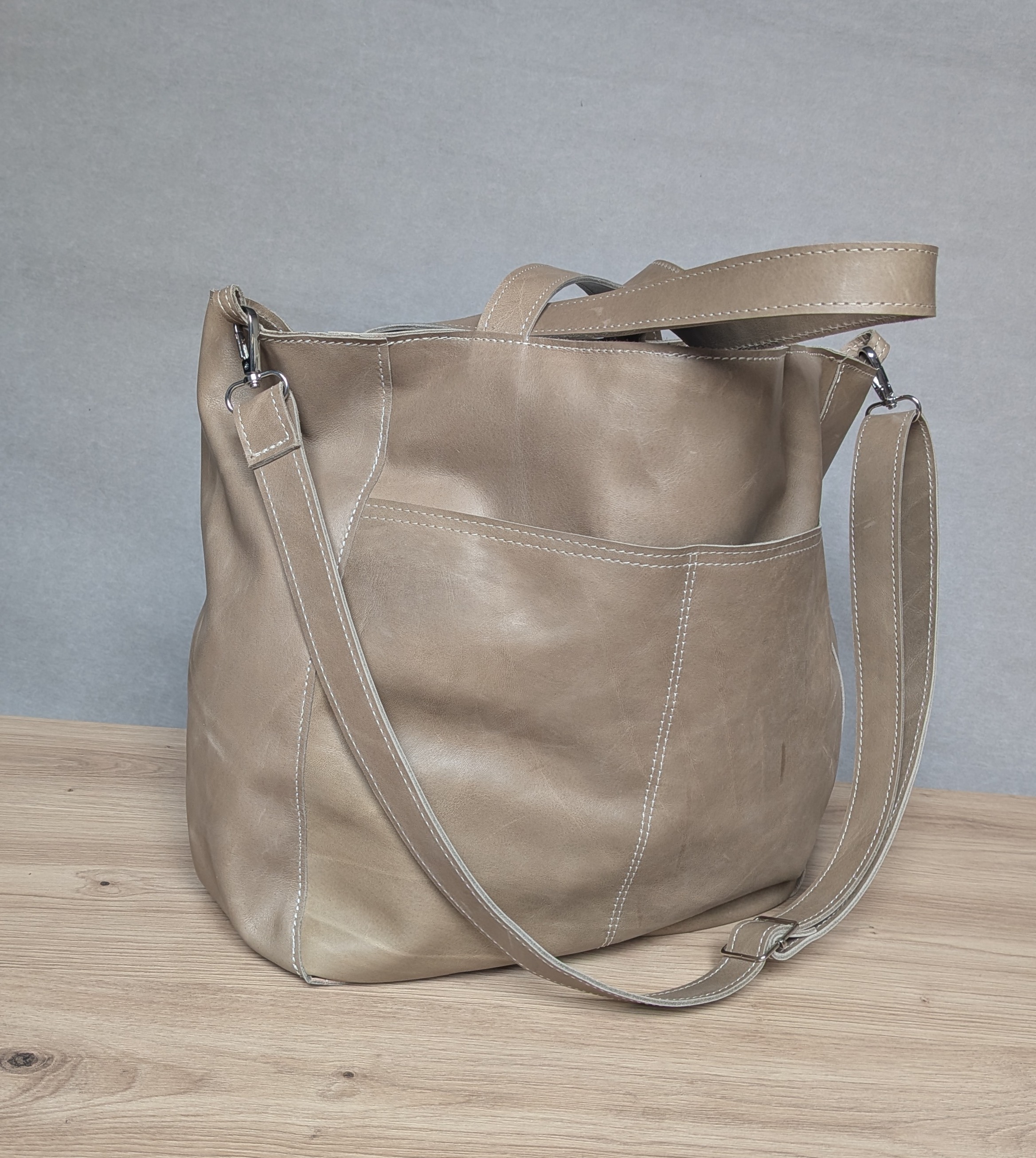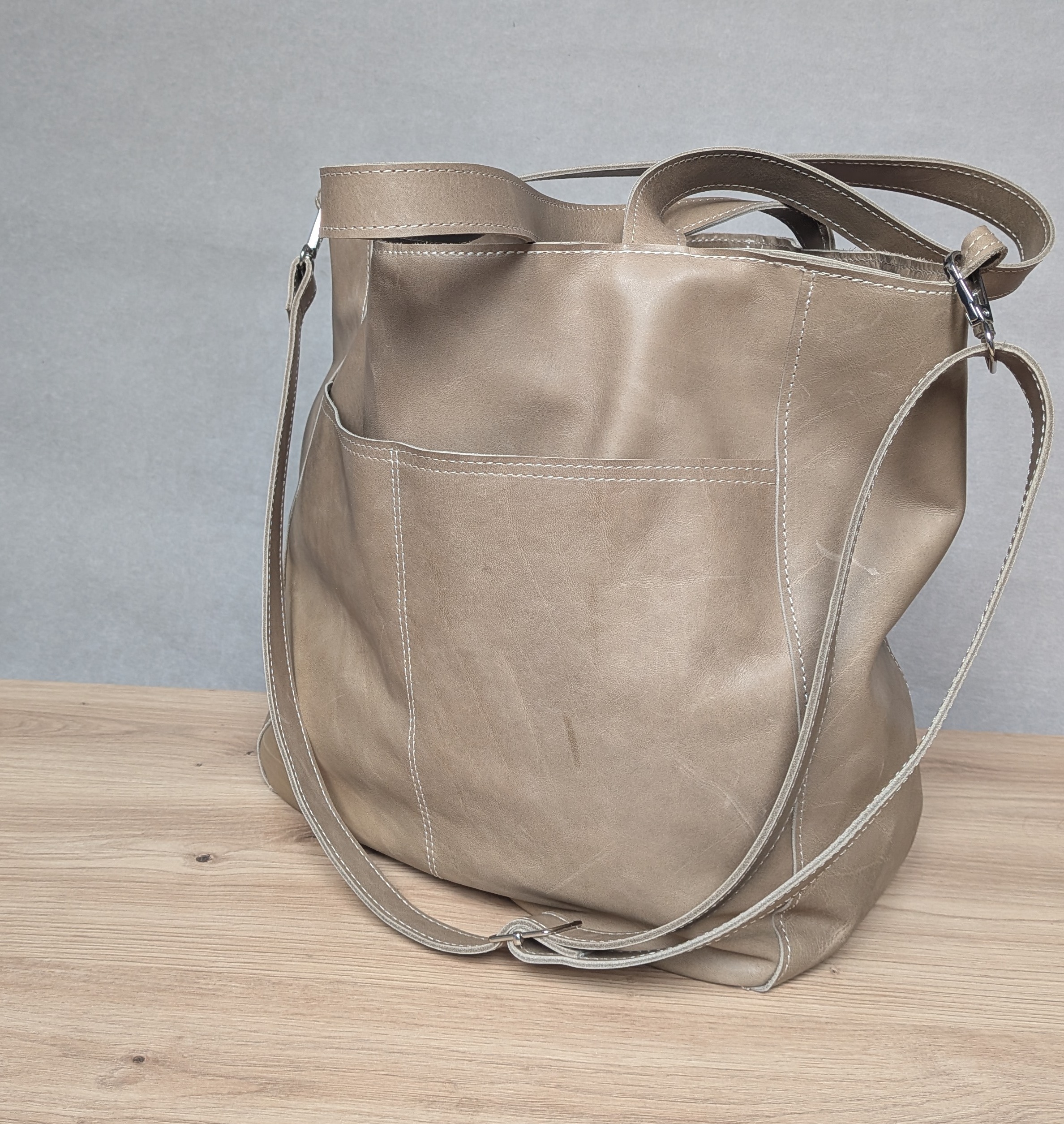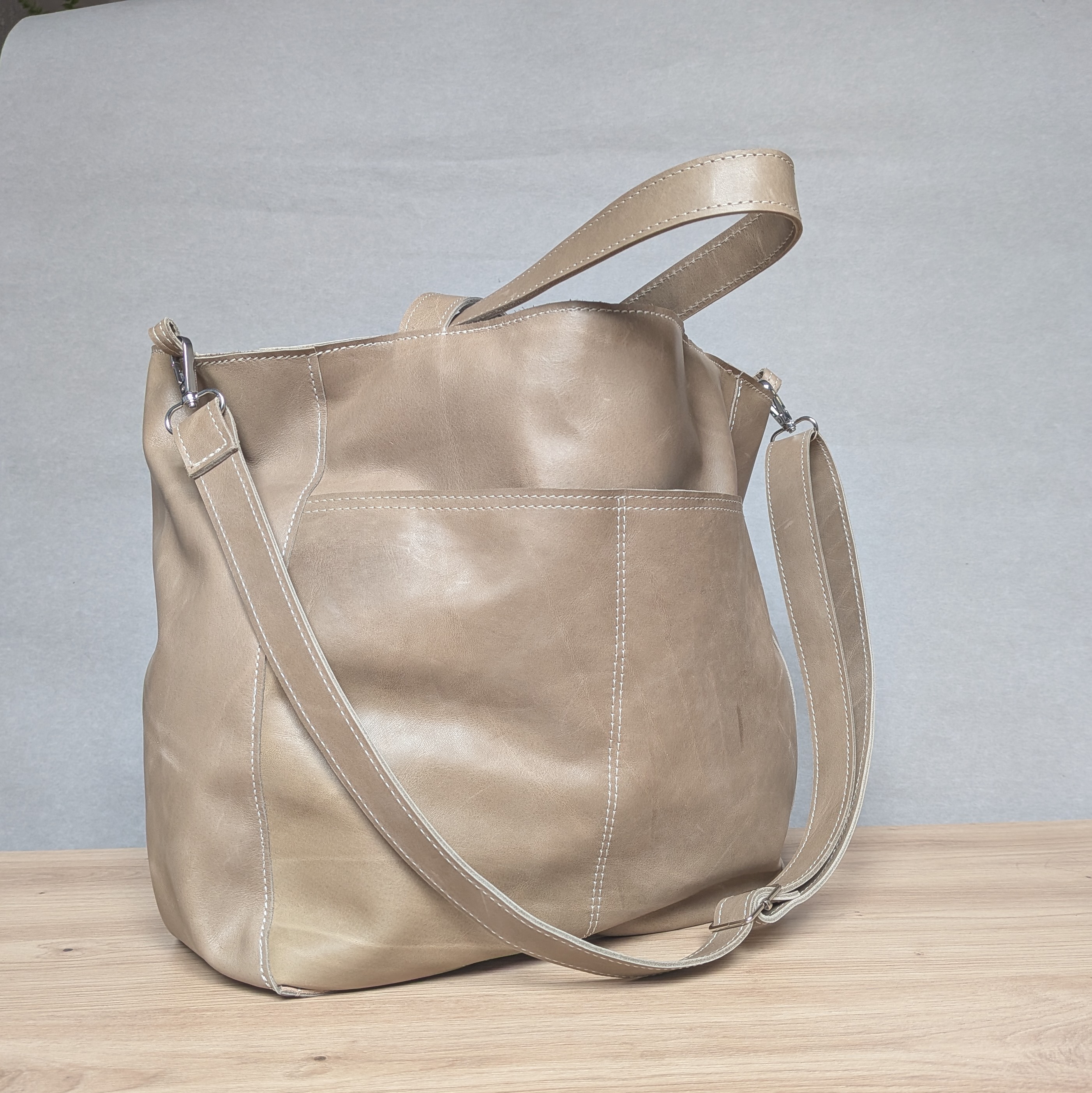 Duża, uszyta ze skóry naturalnej w kolorze jasno beżowym z kroplą oliwki.