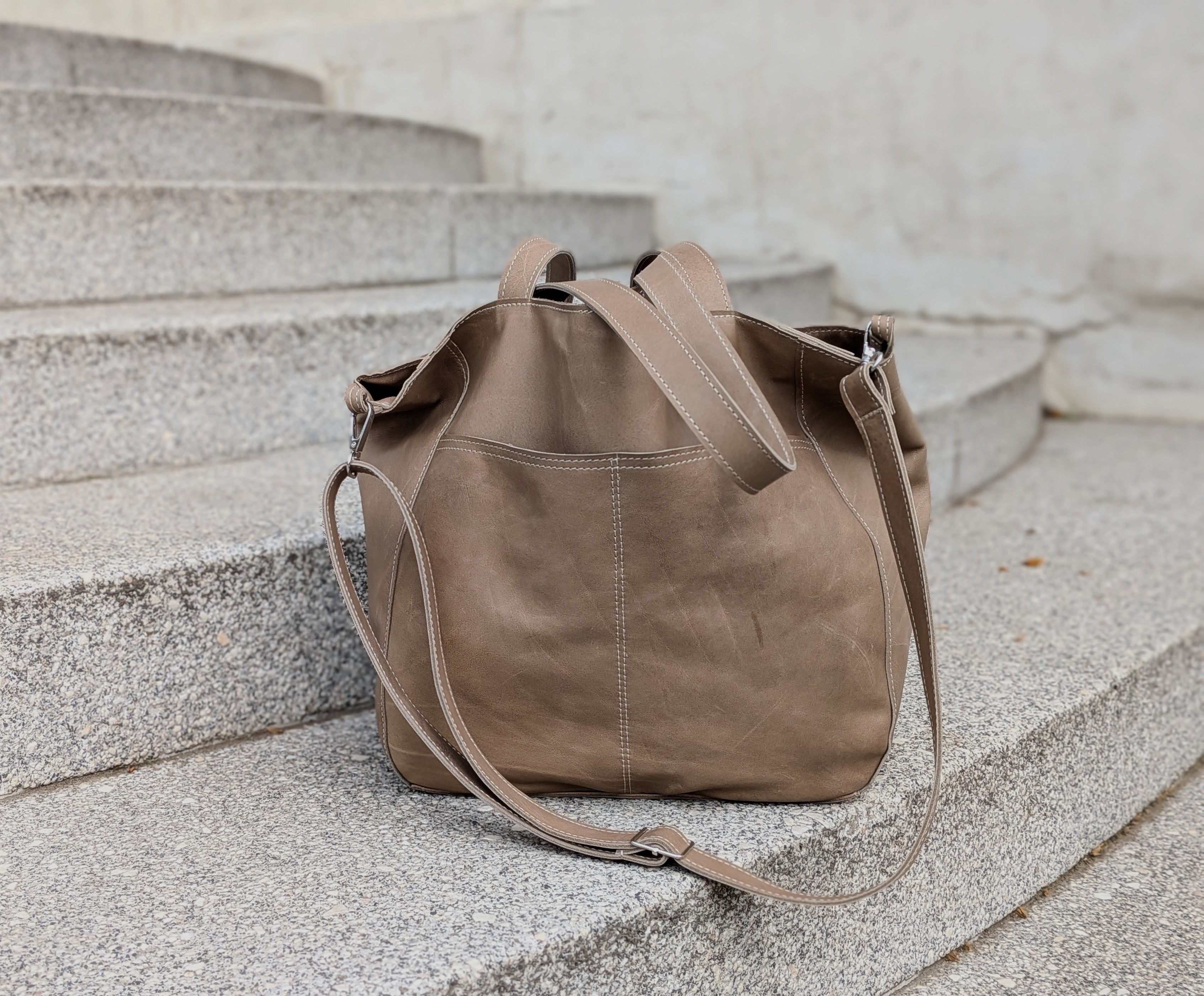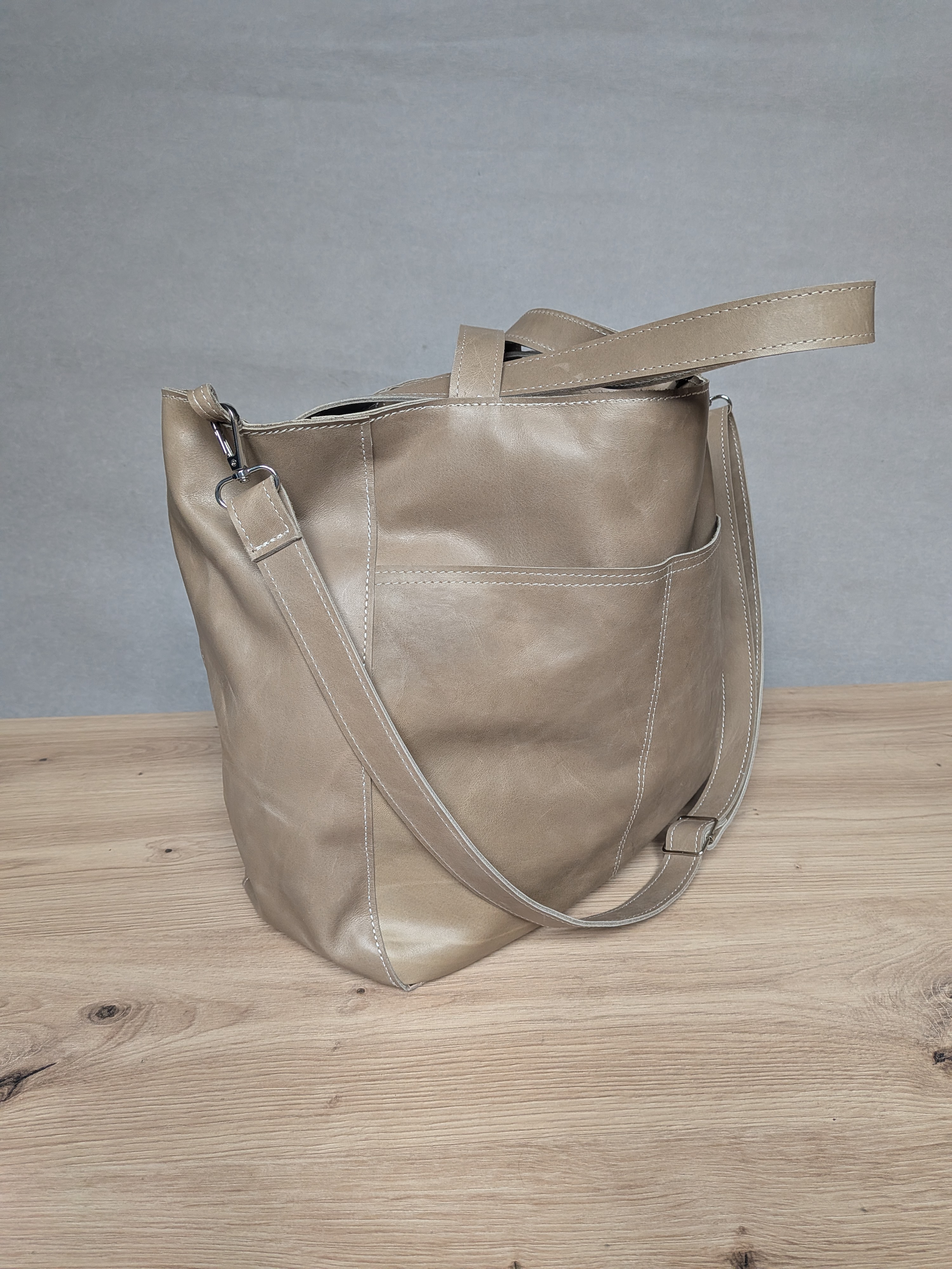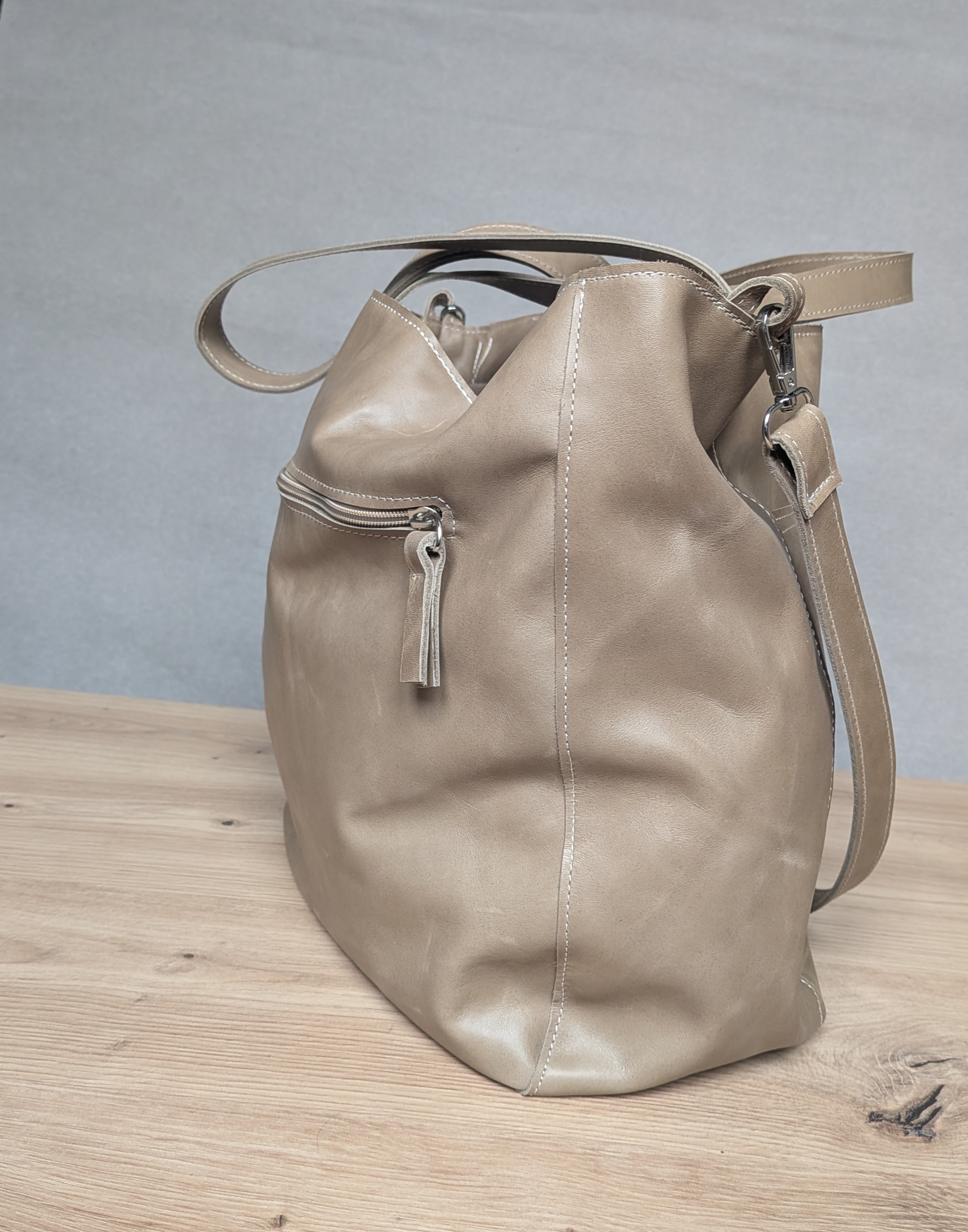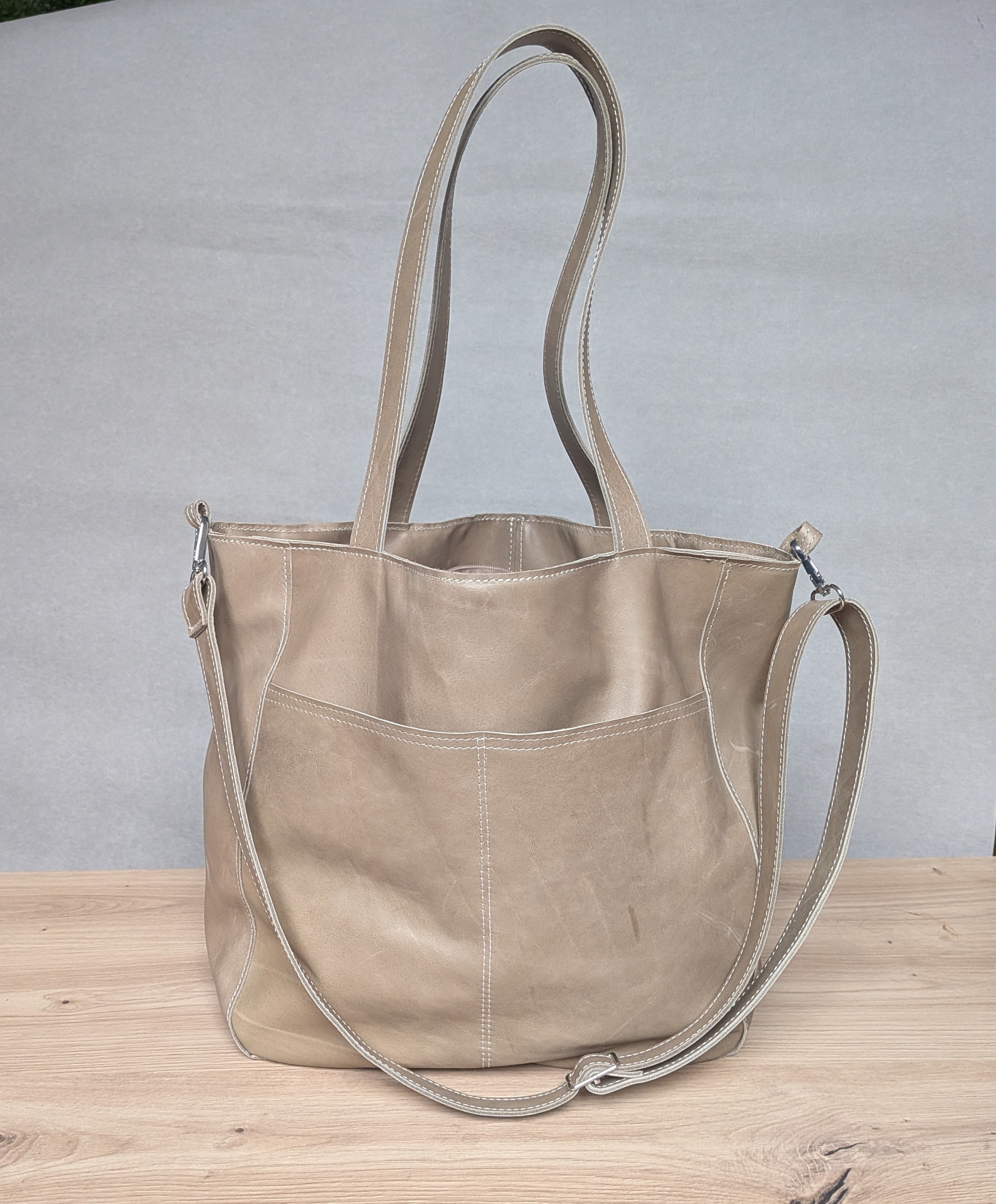 Duża, uszyta ze skóry naturalnej w kolorze jasno beżowym z kroplą oliwki.