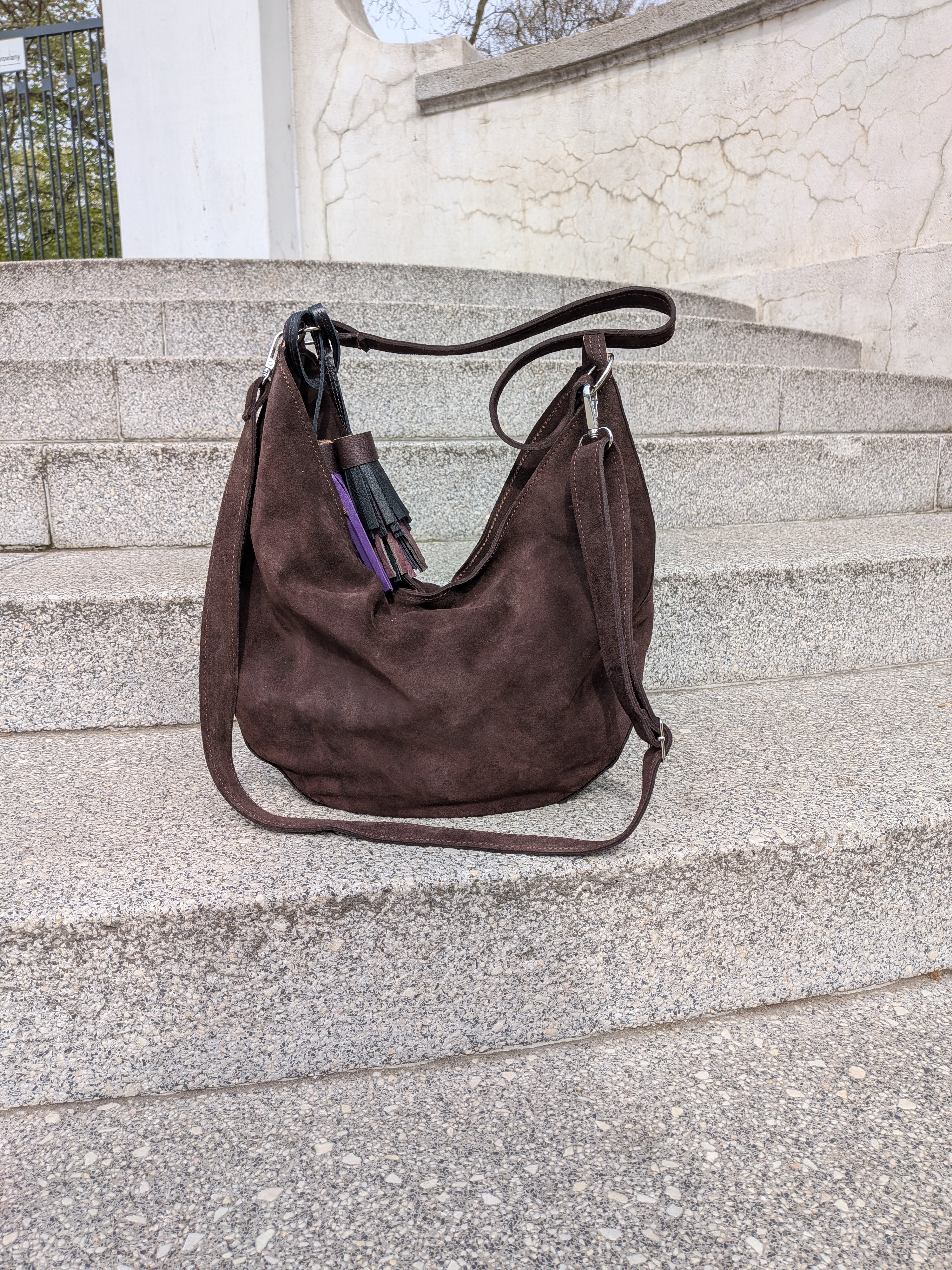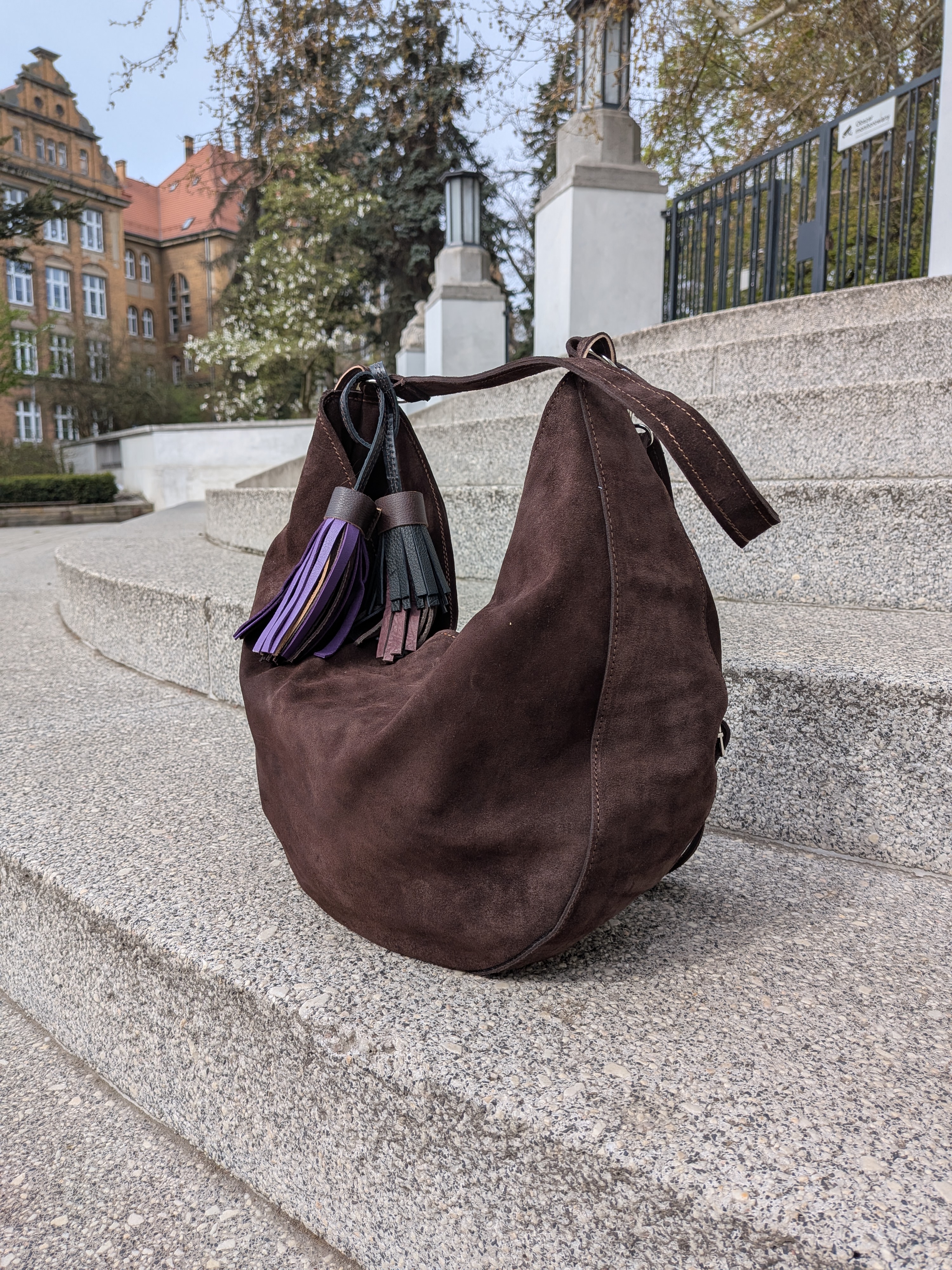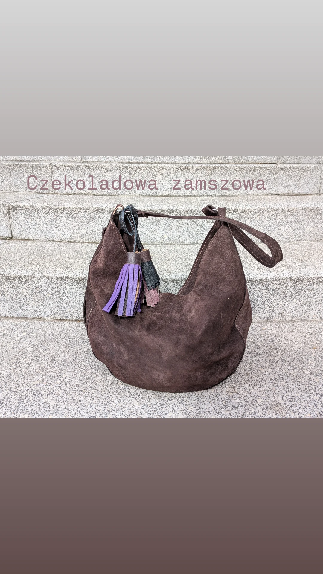 Brązowa czekoladowa zaokrąglona miękka torebka z zamszu