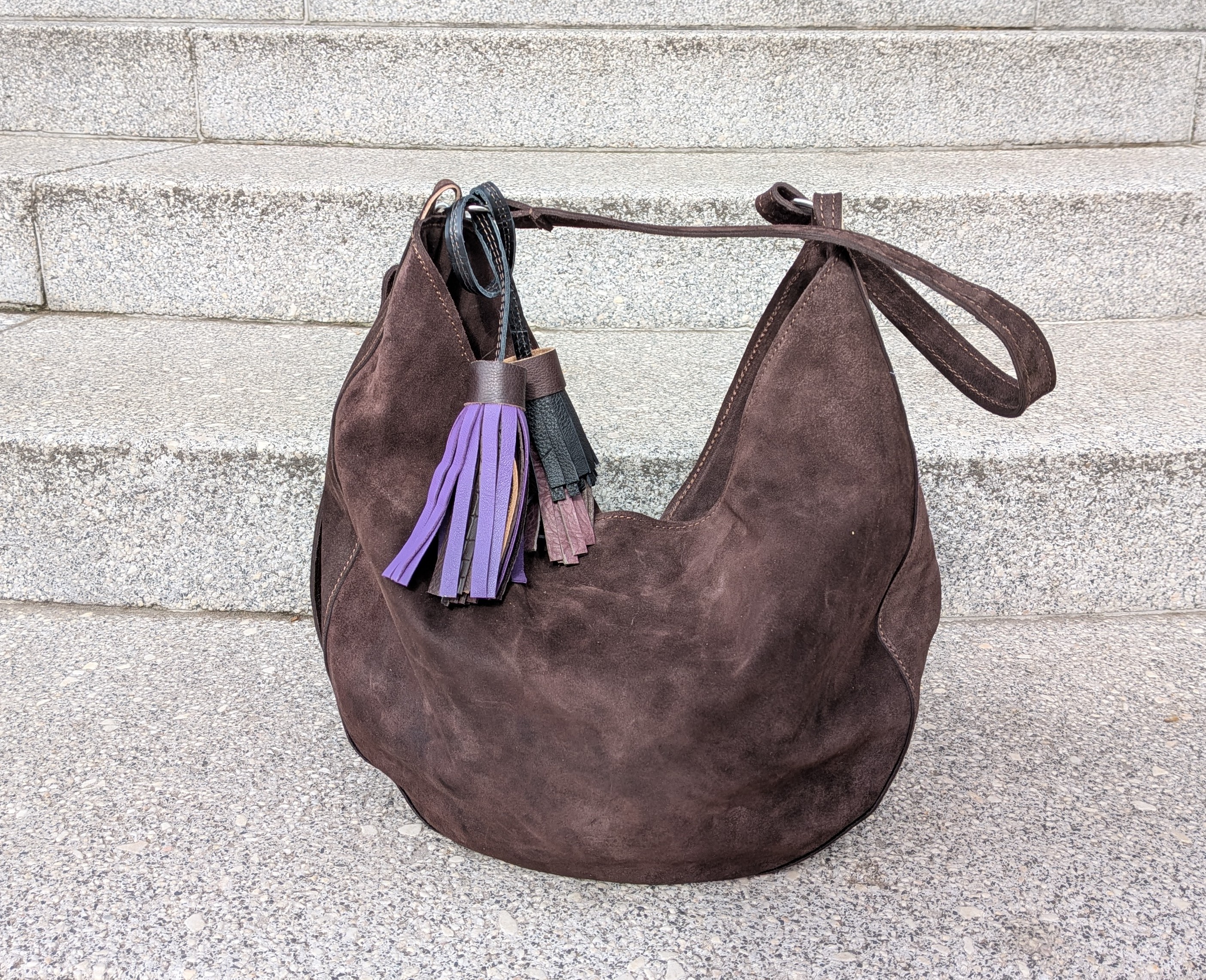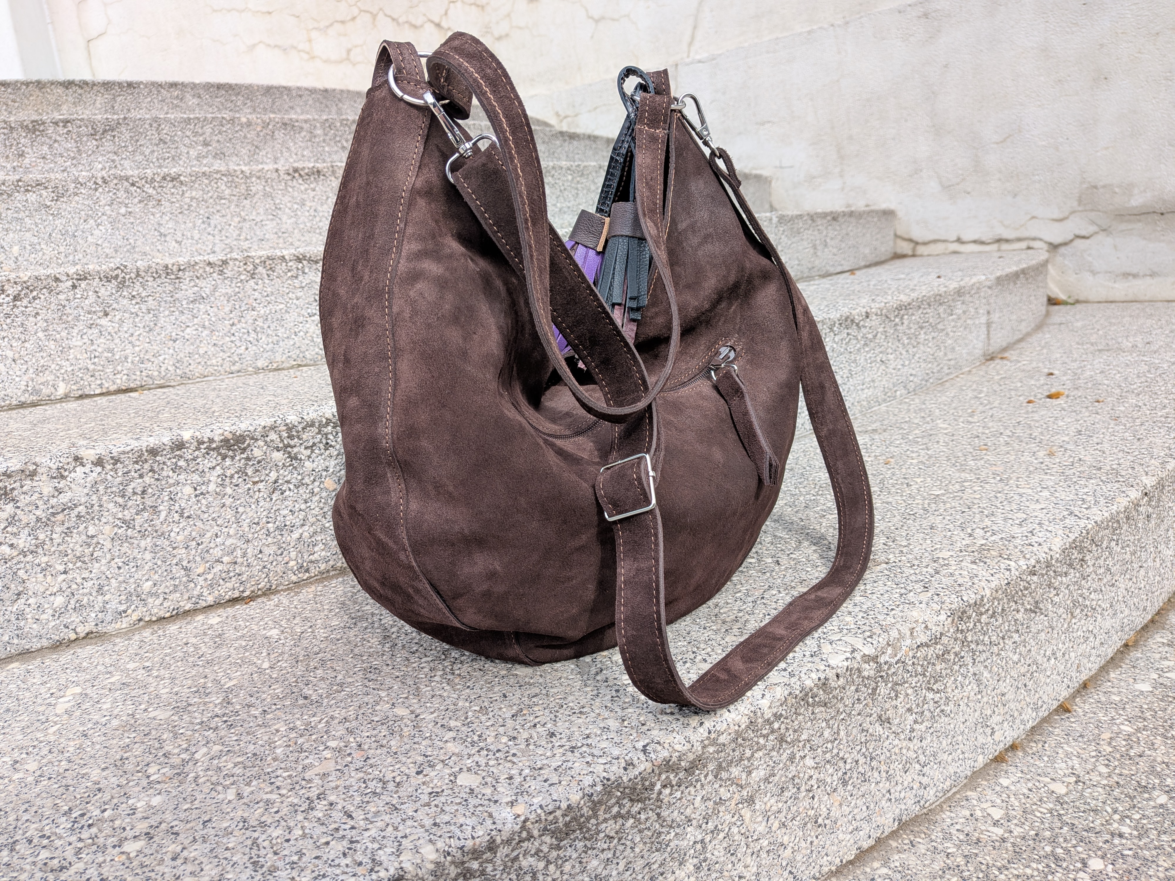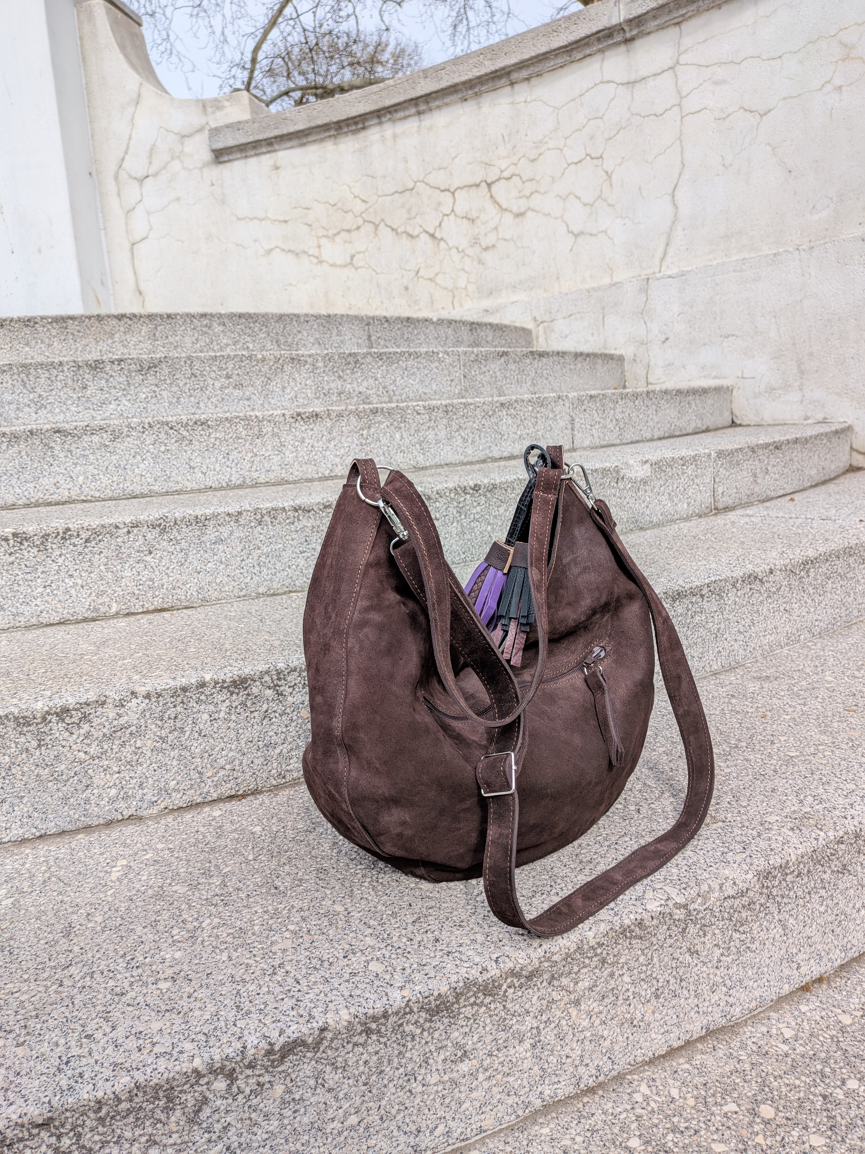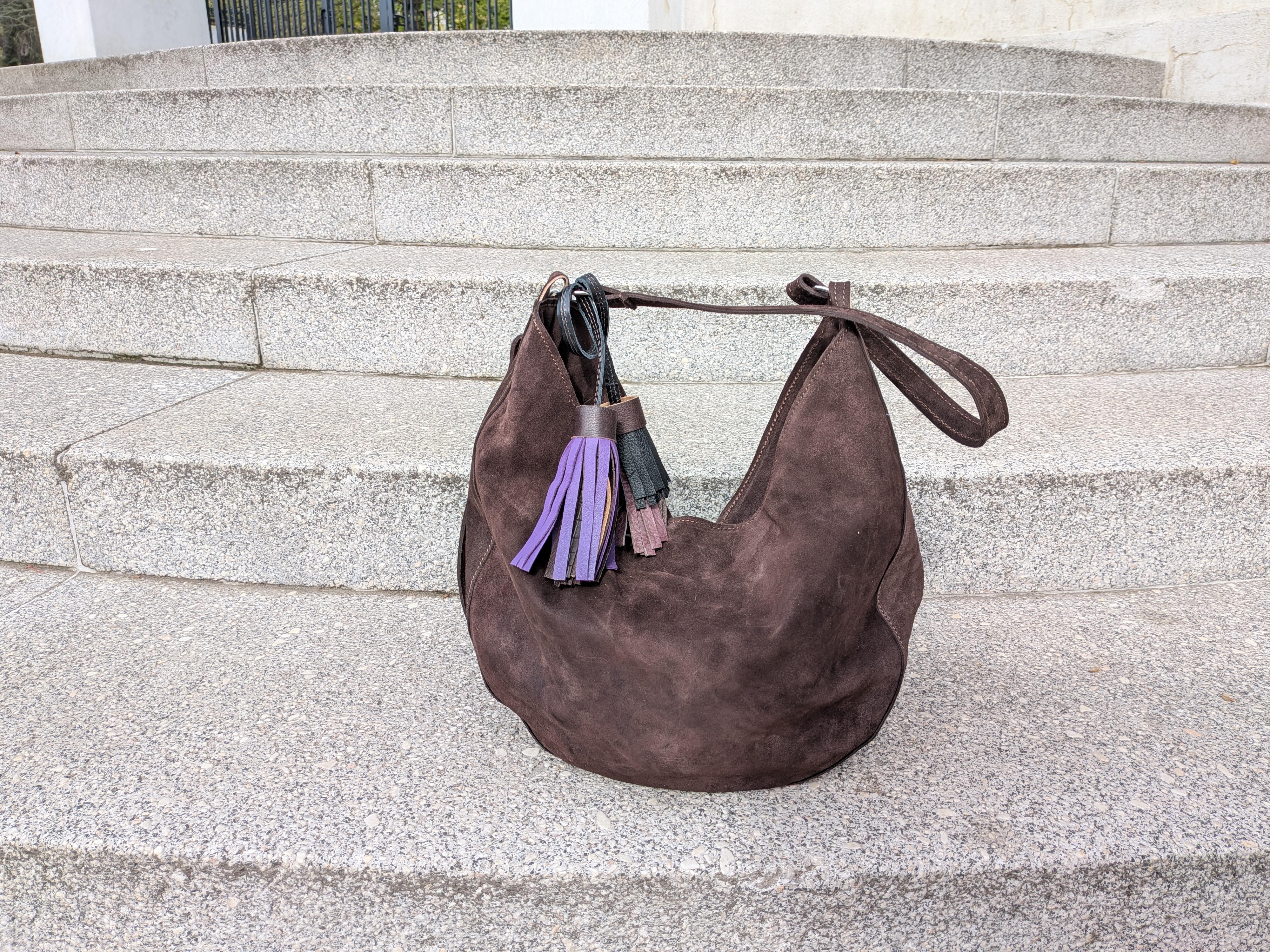 Brązowa czekoladowa zaokrąglona miękka torebka z zamszu