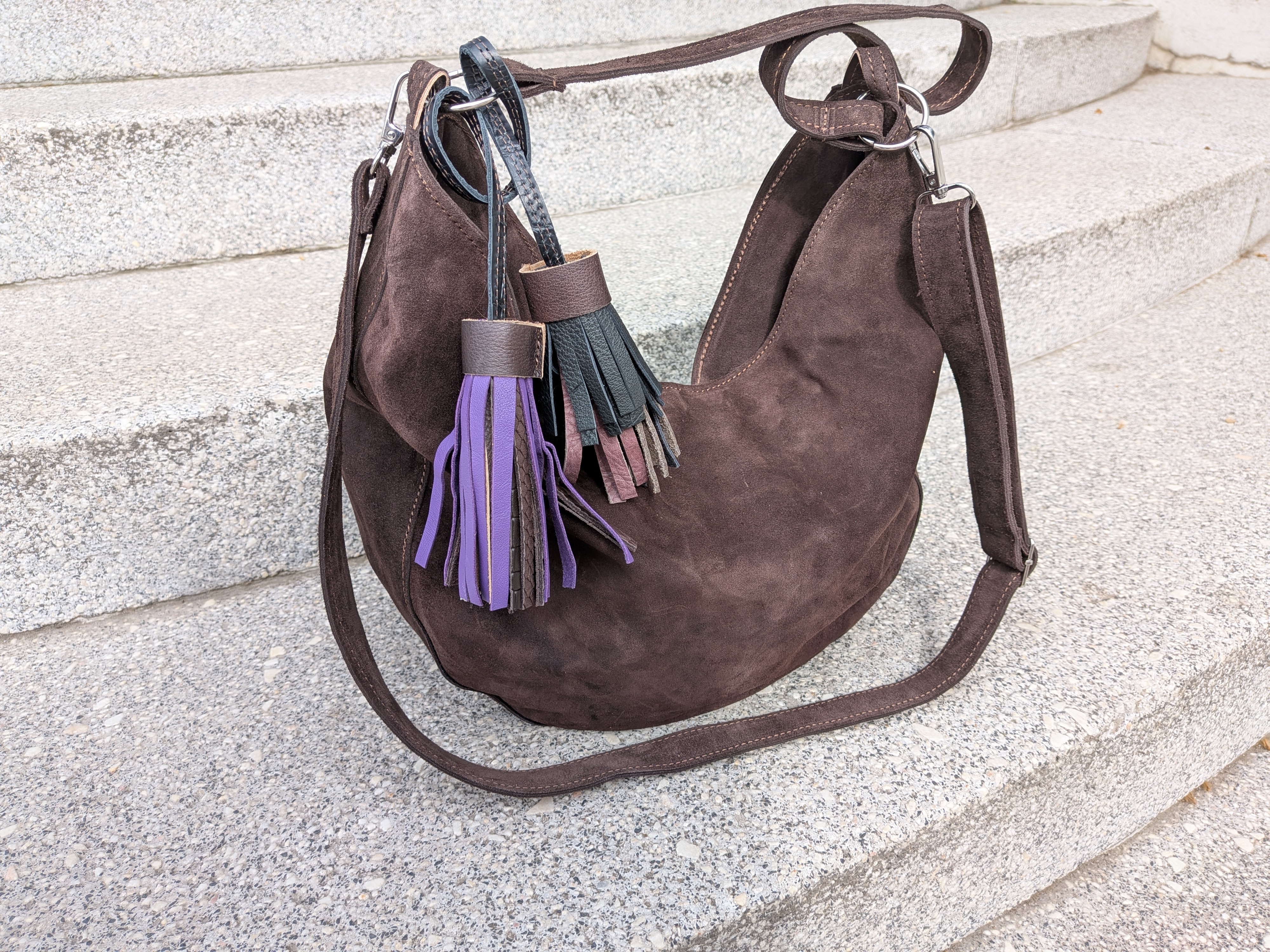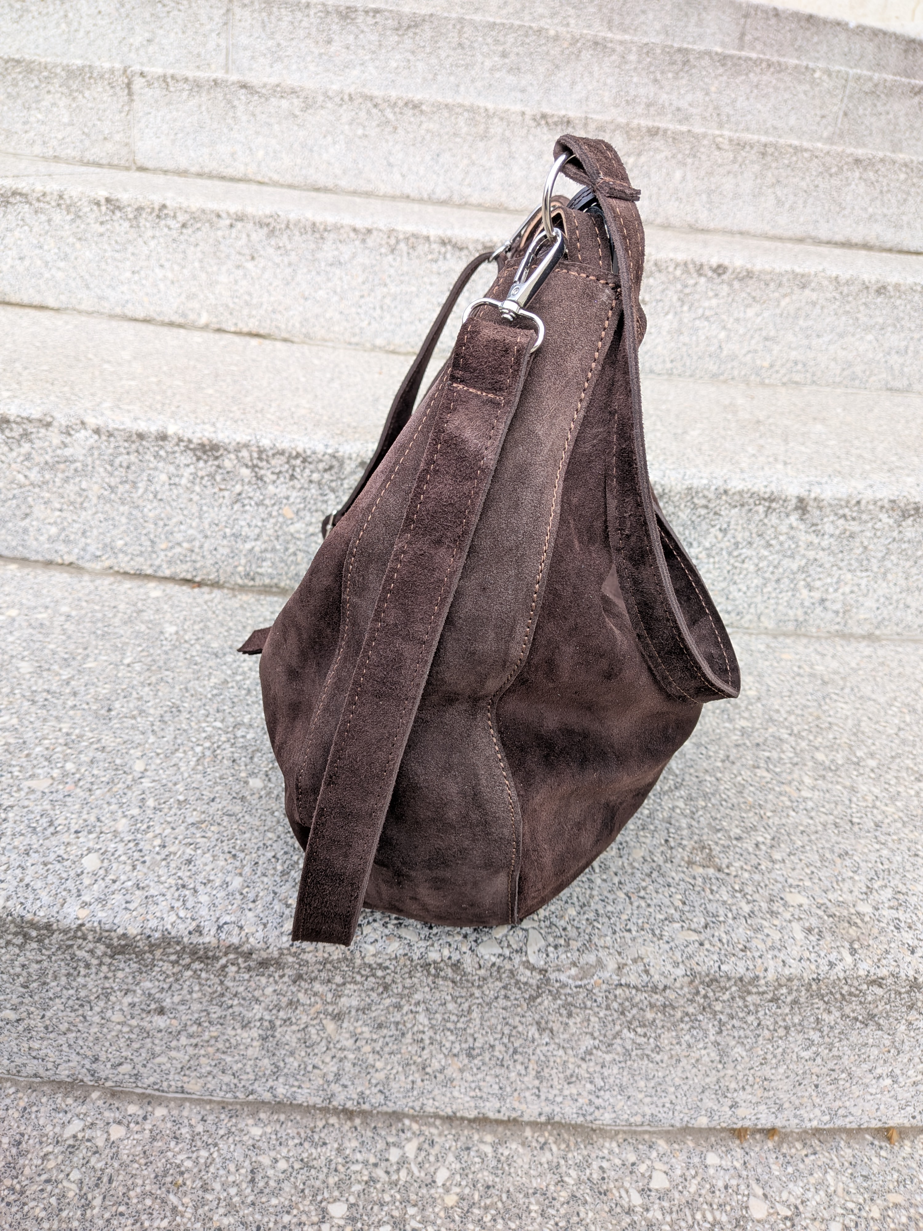 Miękka zaokrąglona torebka w stylu "banana bag". Do noszenia na krótkim pasku ciasno na ramieniu lub na skos na regulowanym. Uszyta z niezwykle miękkiej brązowej skóry naturalnej typu zamsz. Cudowna na lato i po lecie .