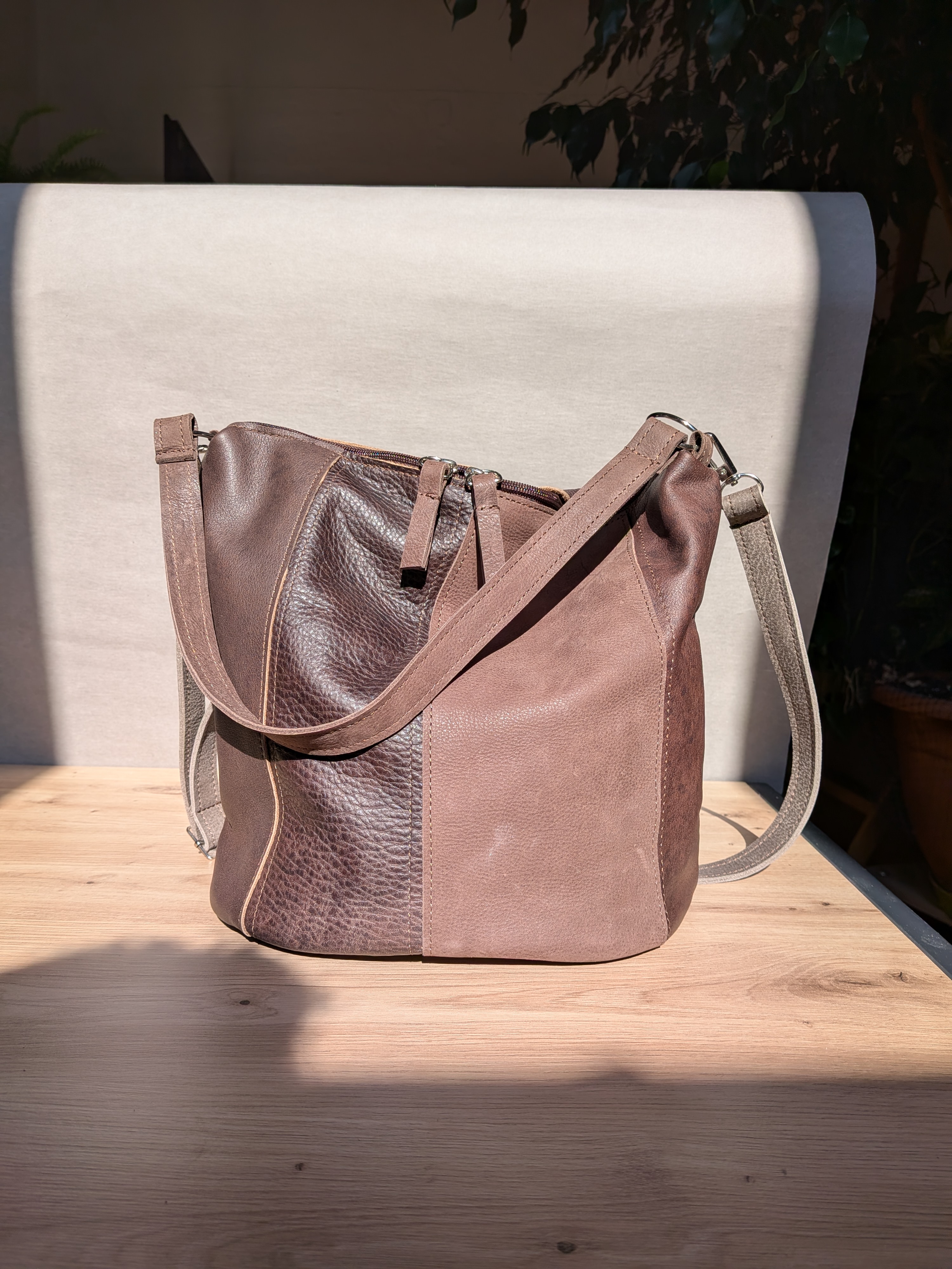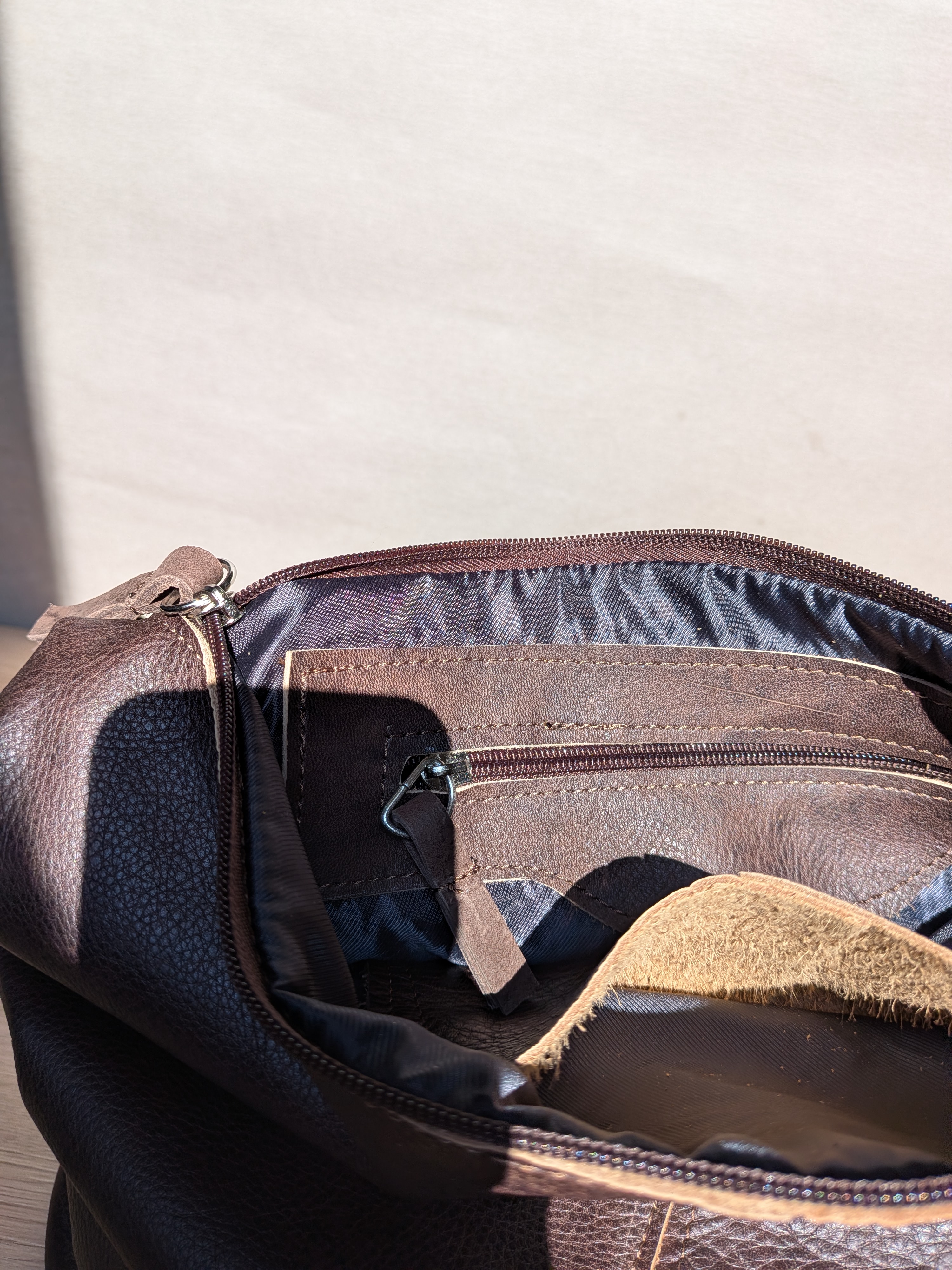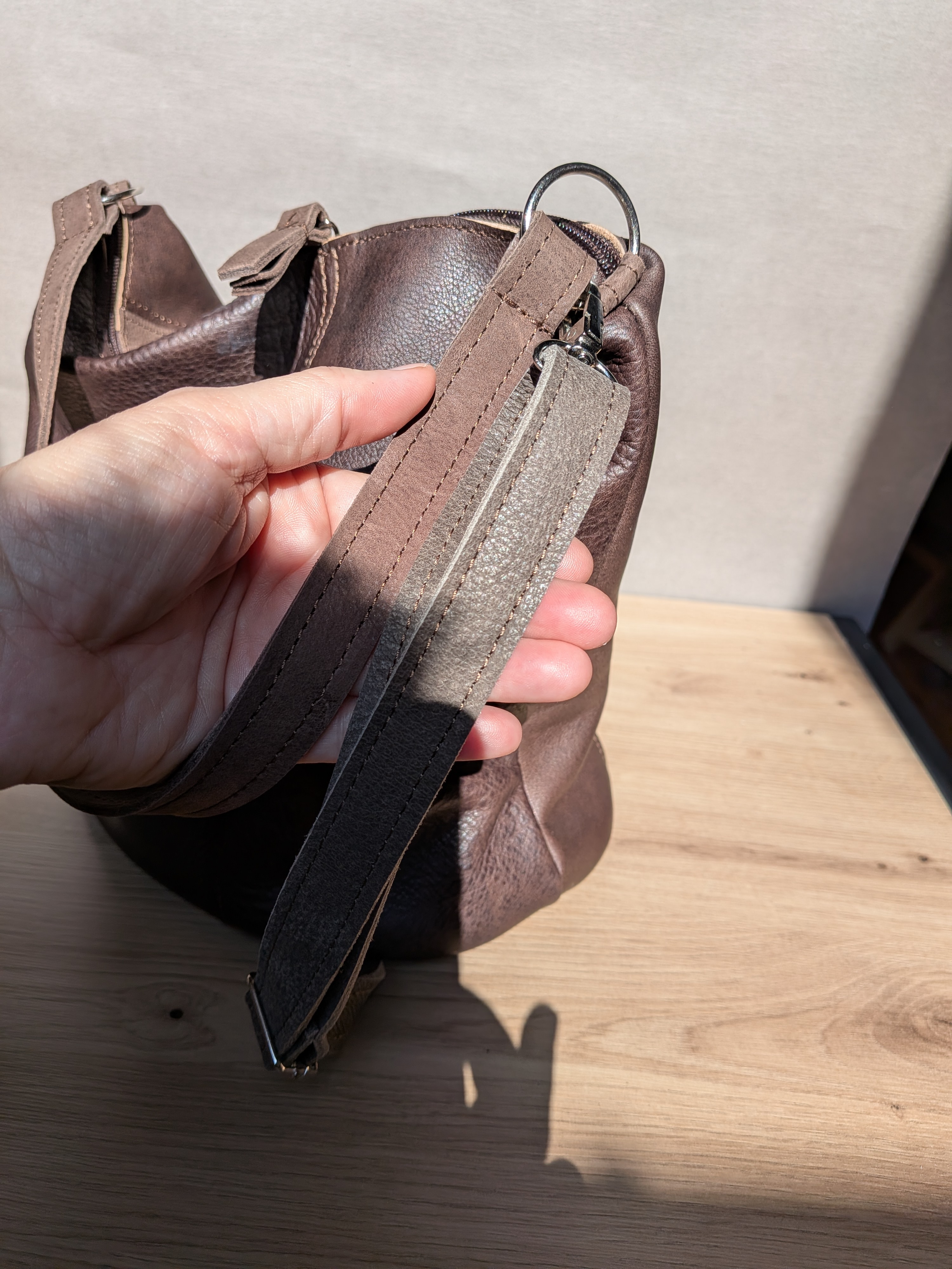 - piękna czekoladowa licowa skóra połączona z podobną w kolorze tabaczkowym