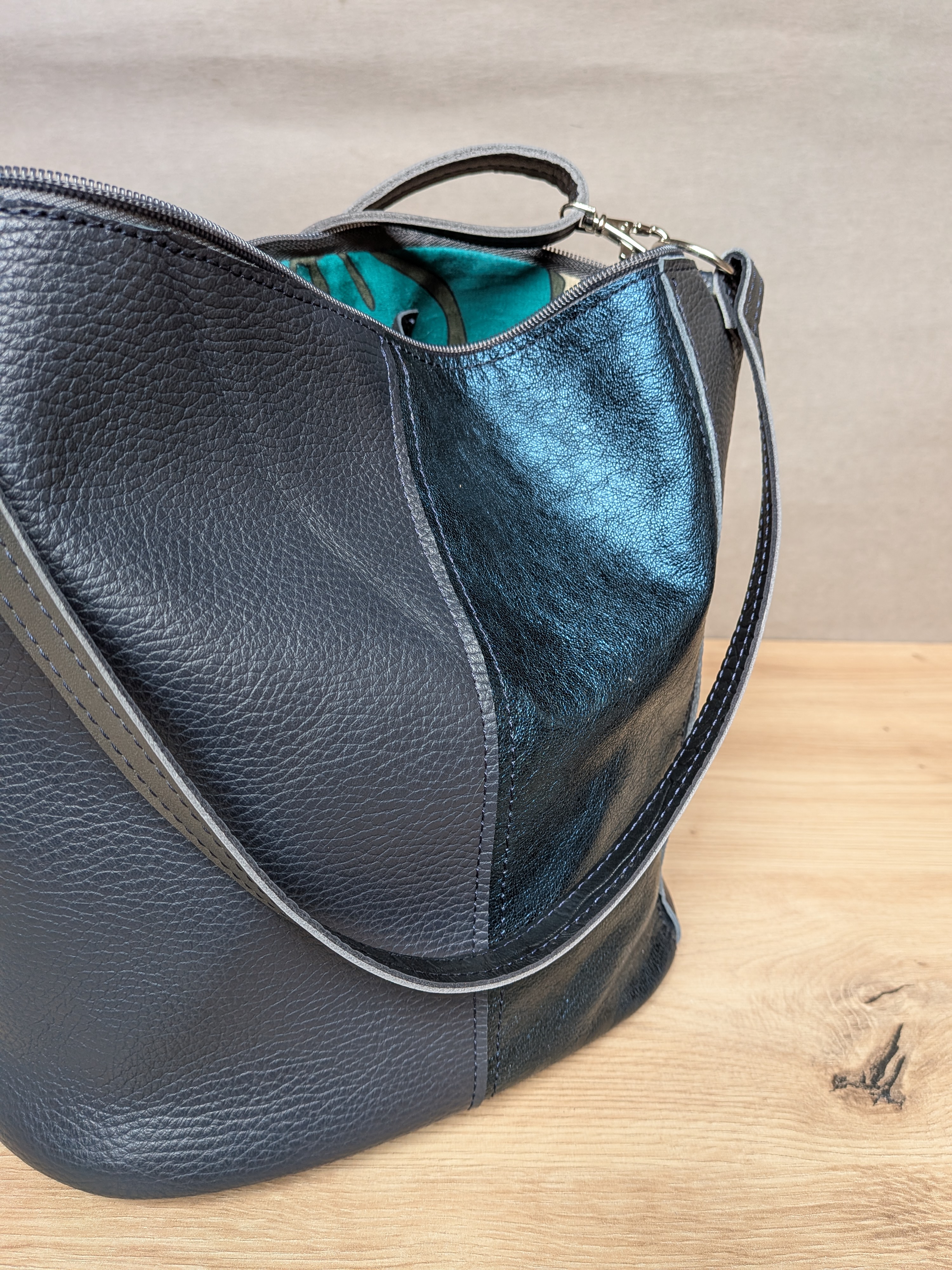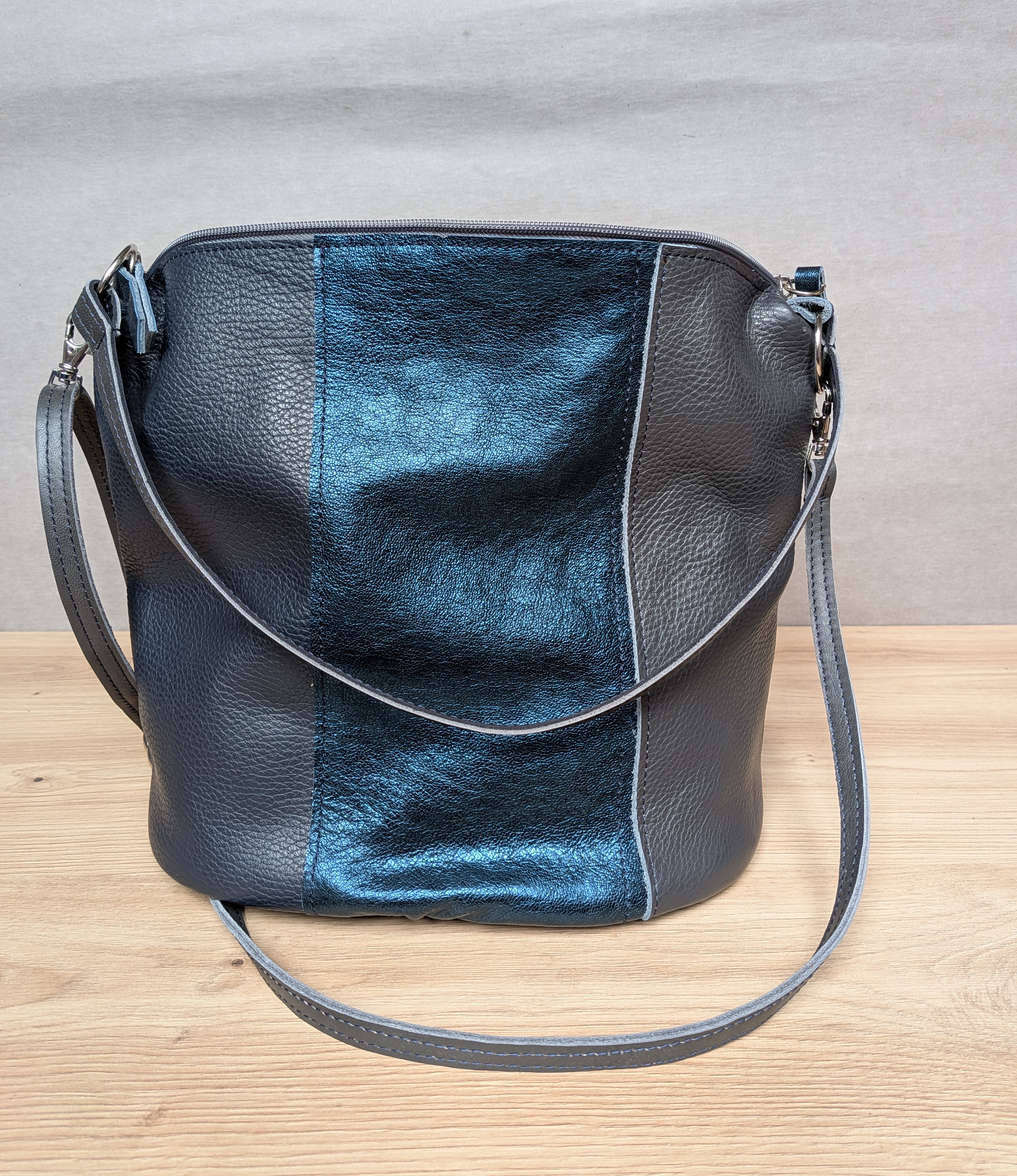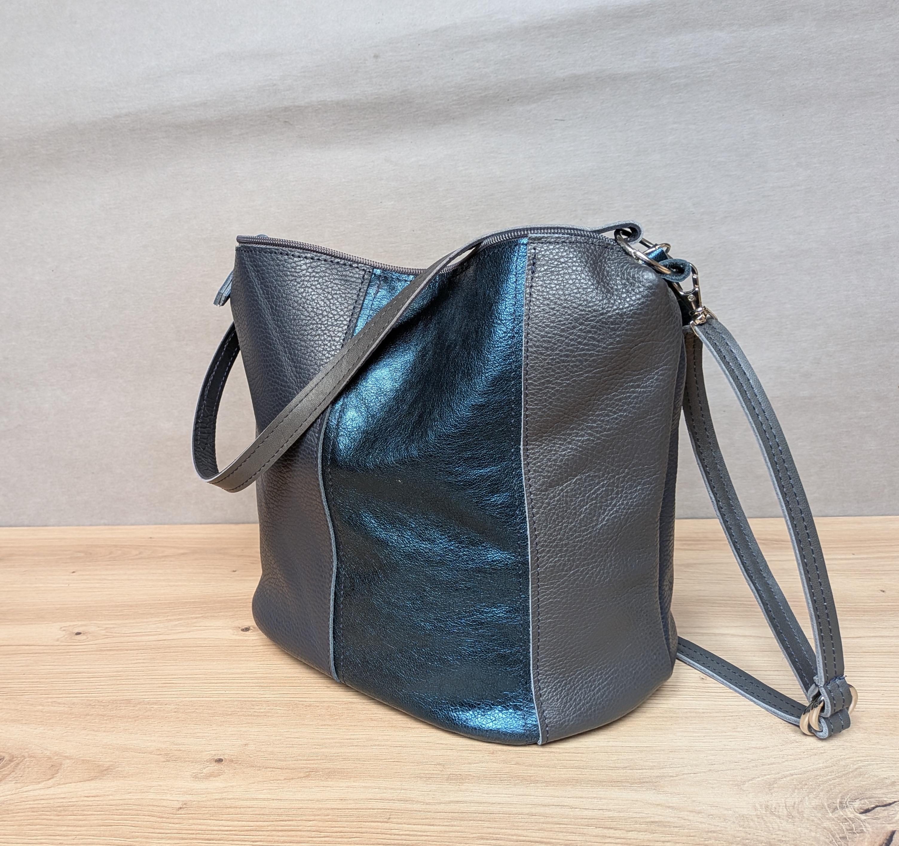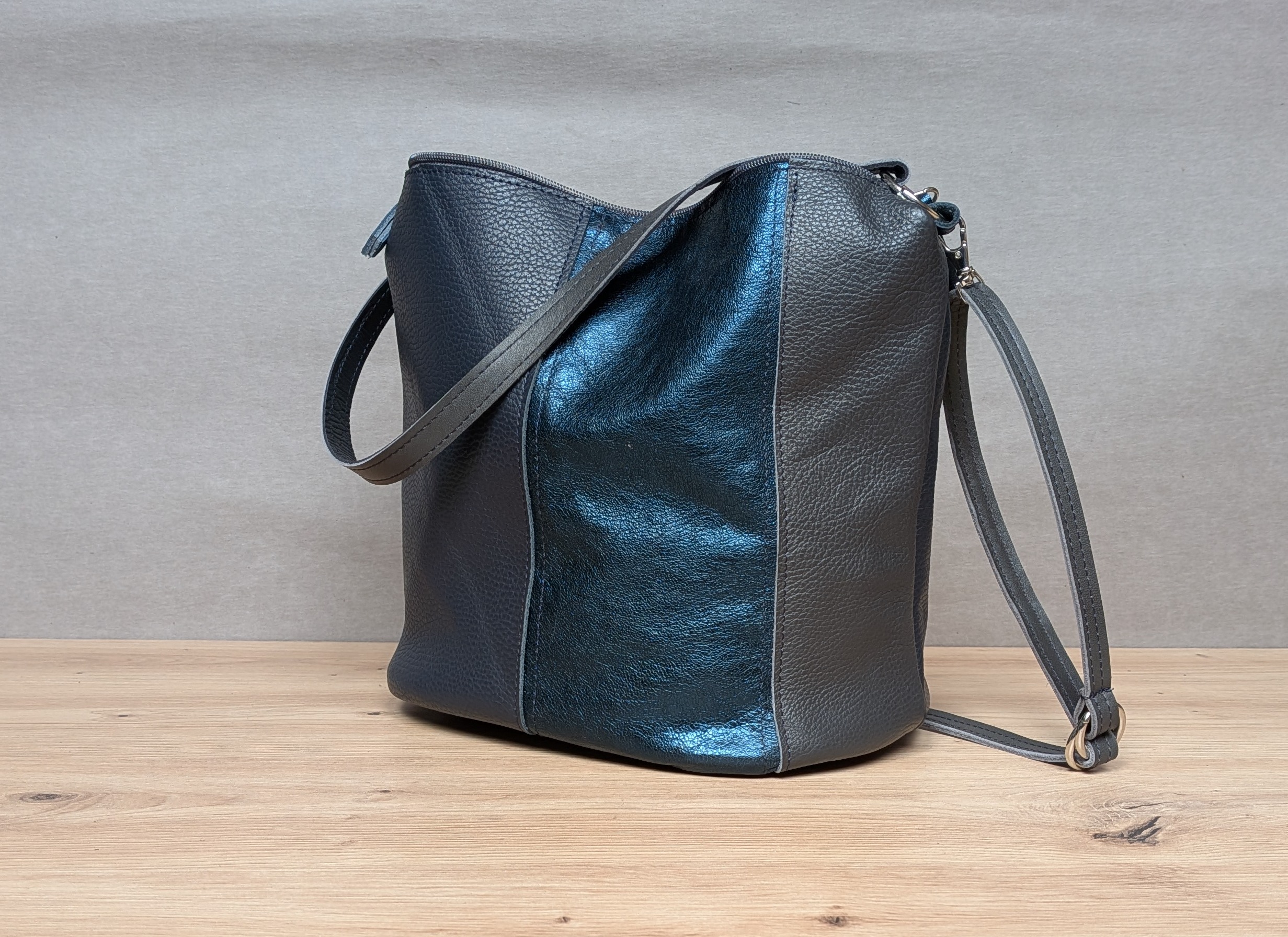 Grafitowo-granatowy z akcentem metalicznym torebka typu bucket.