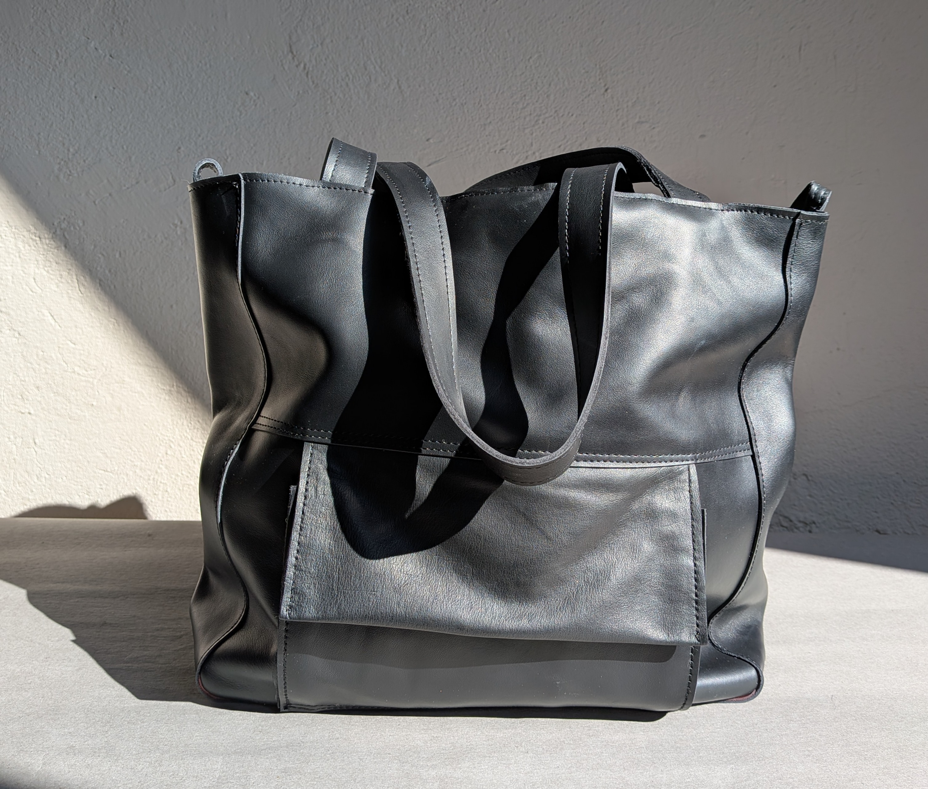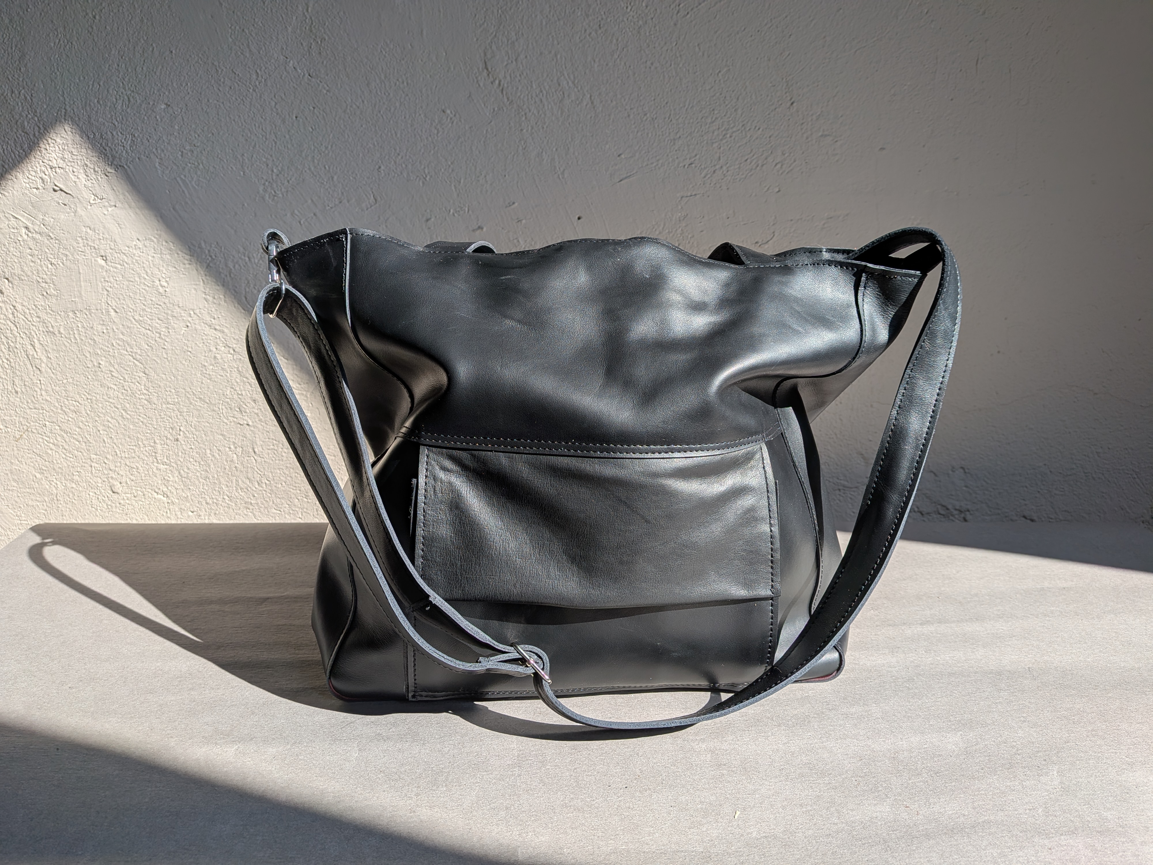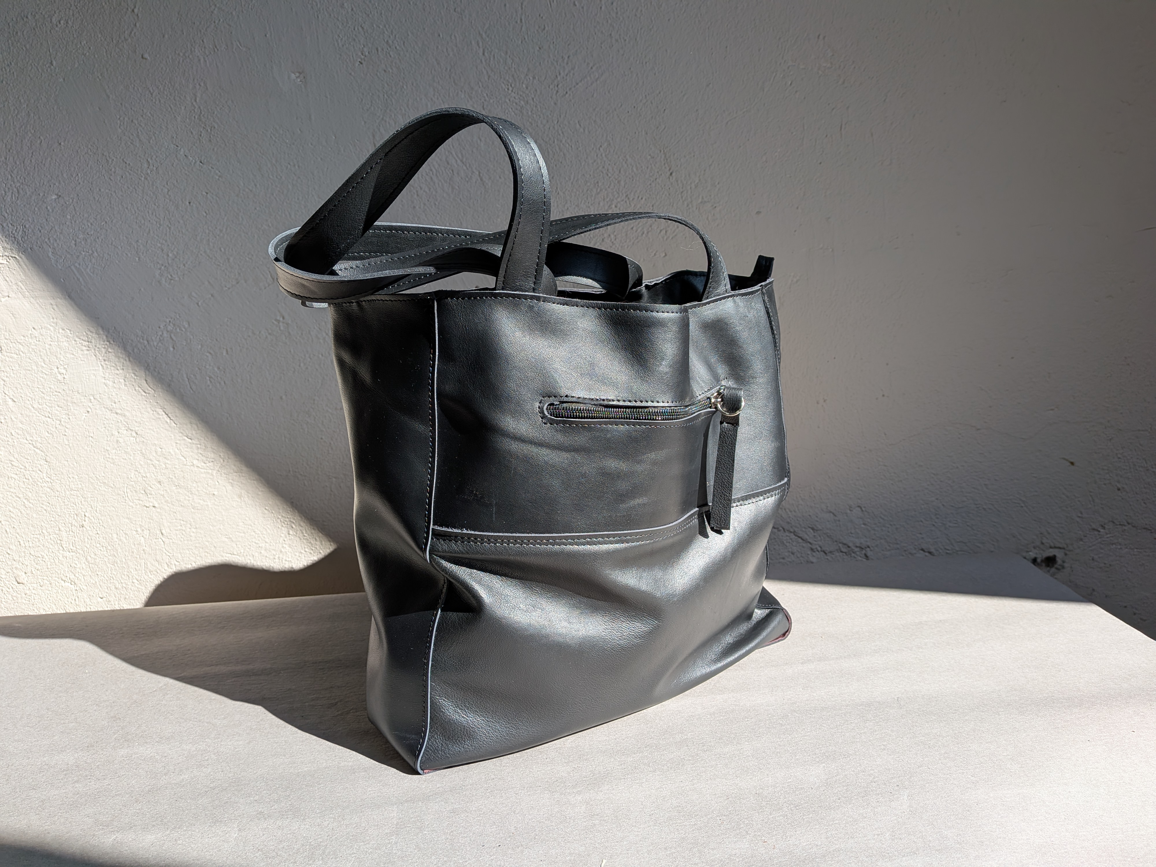 Duża skórzana torba uszyta ze skóry naturalnej. Skóra gładka, miękka, mięsista.