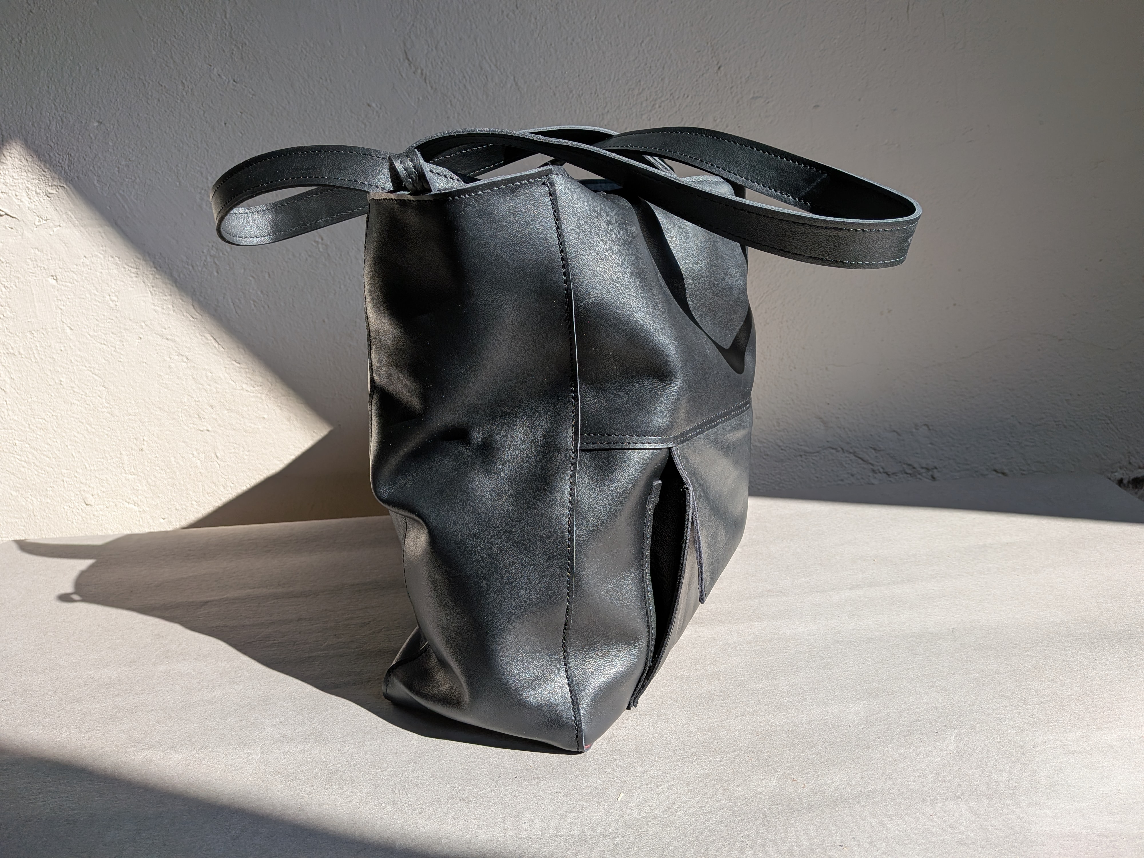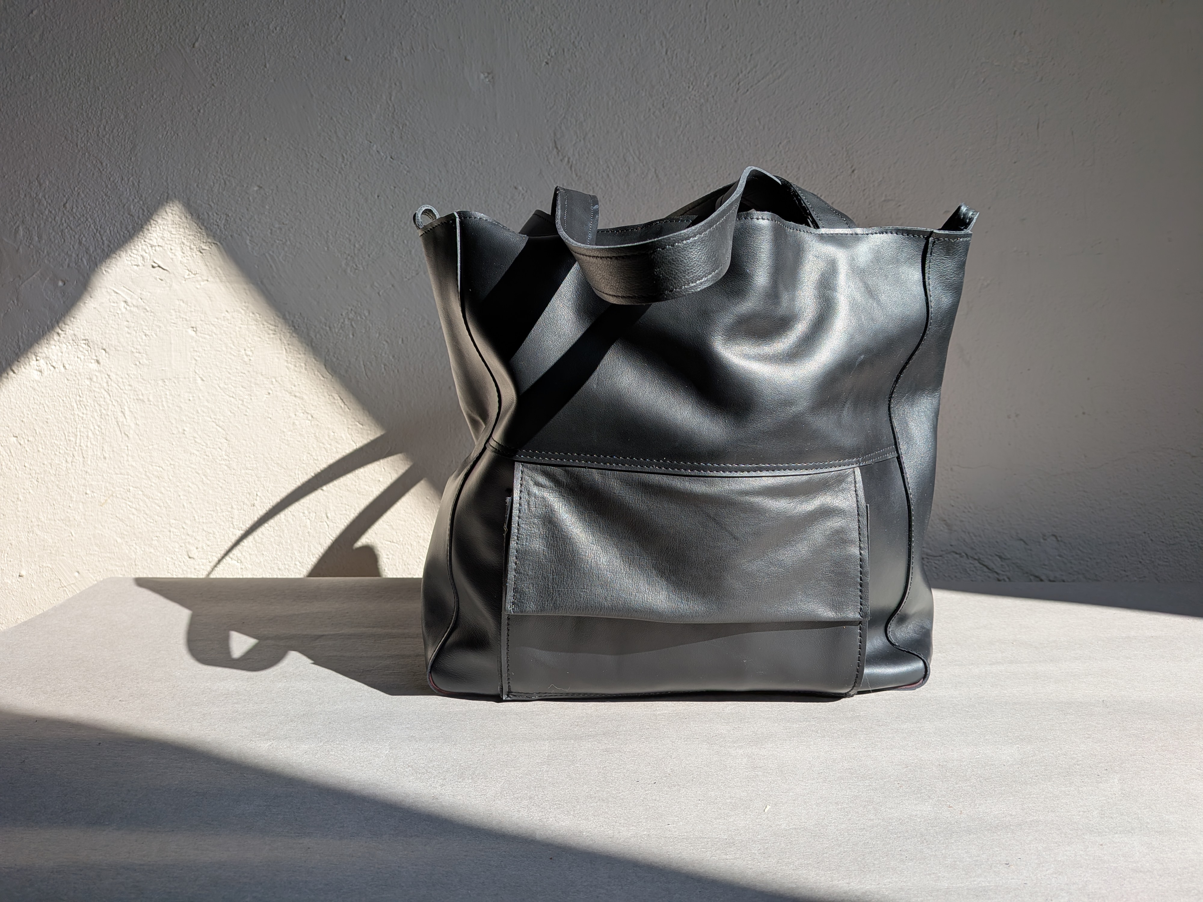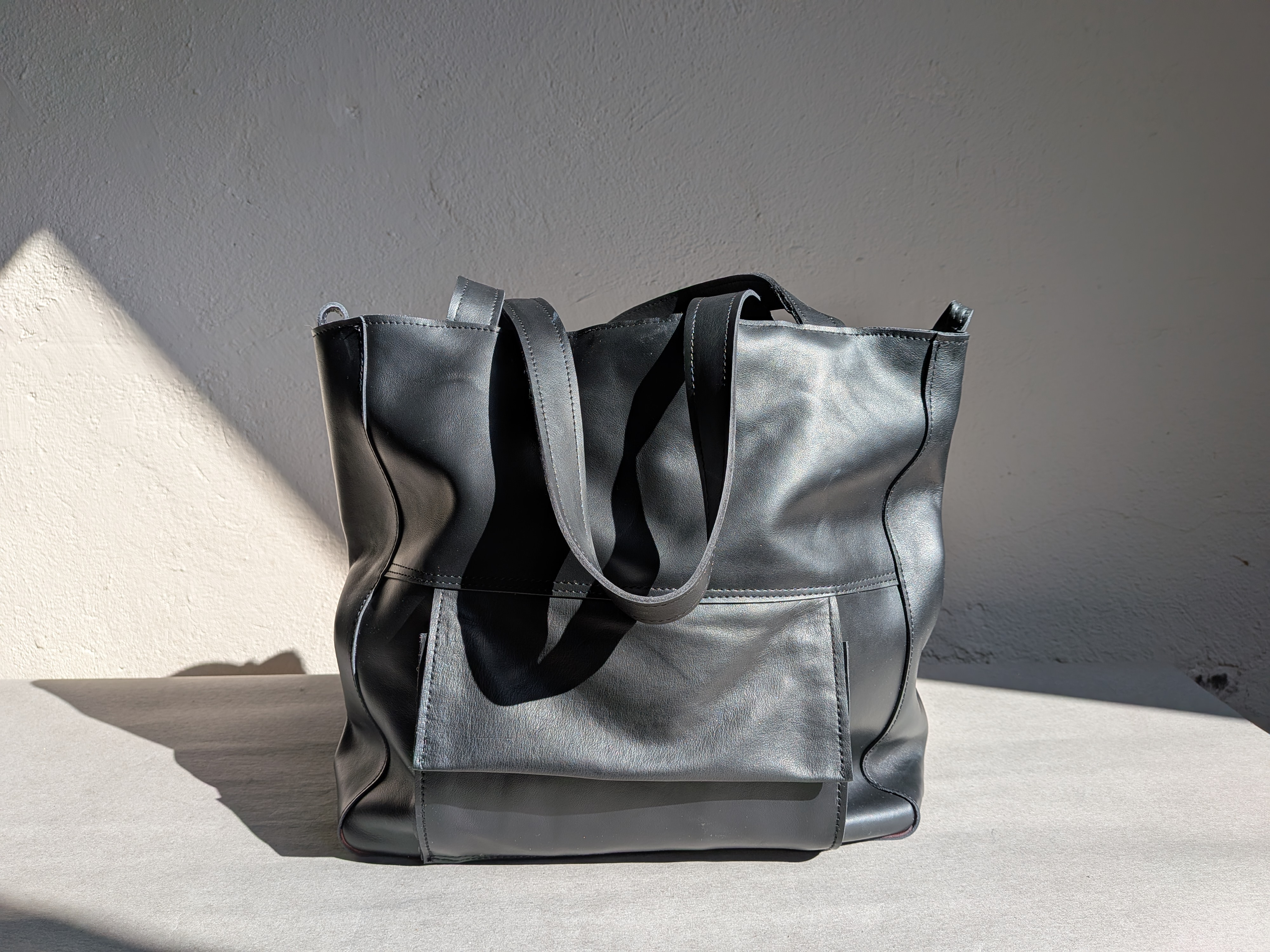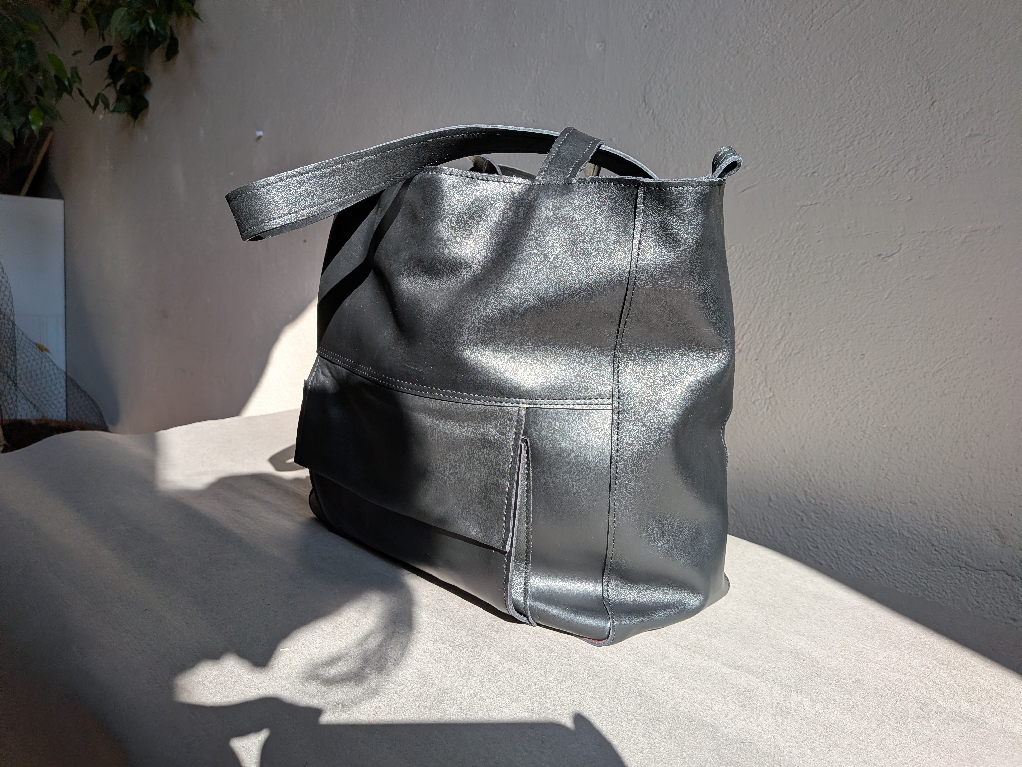 Duża skórzana torba uszyta ze skóry naturalnej. Skóra gładka, miękka, mięsista.