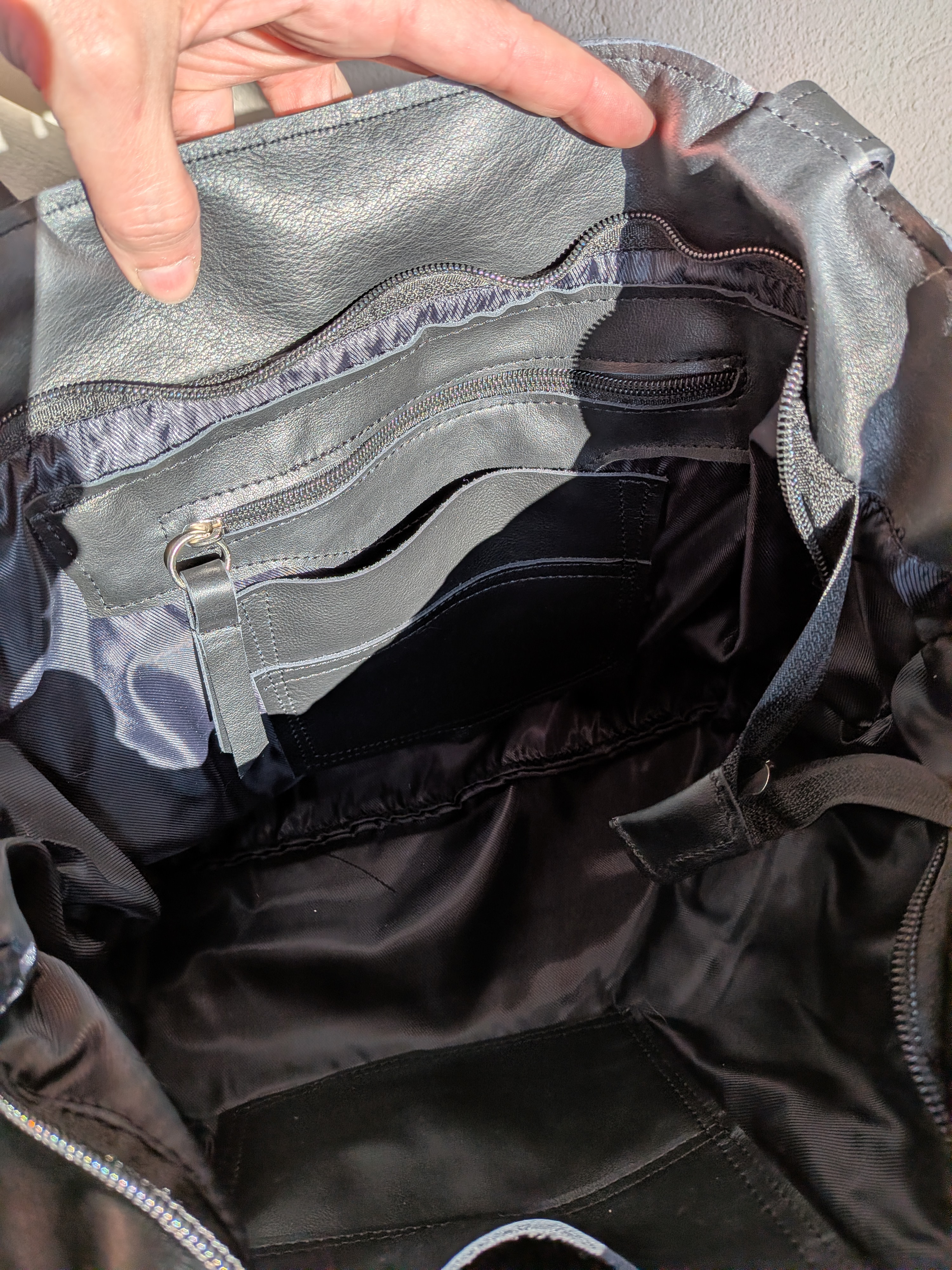Wewnątrz podszewka czarna. 1 kieszeń na zamek, 1 kieszeń na telefon