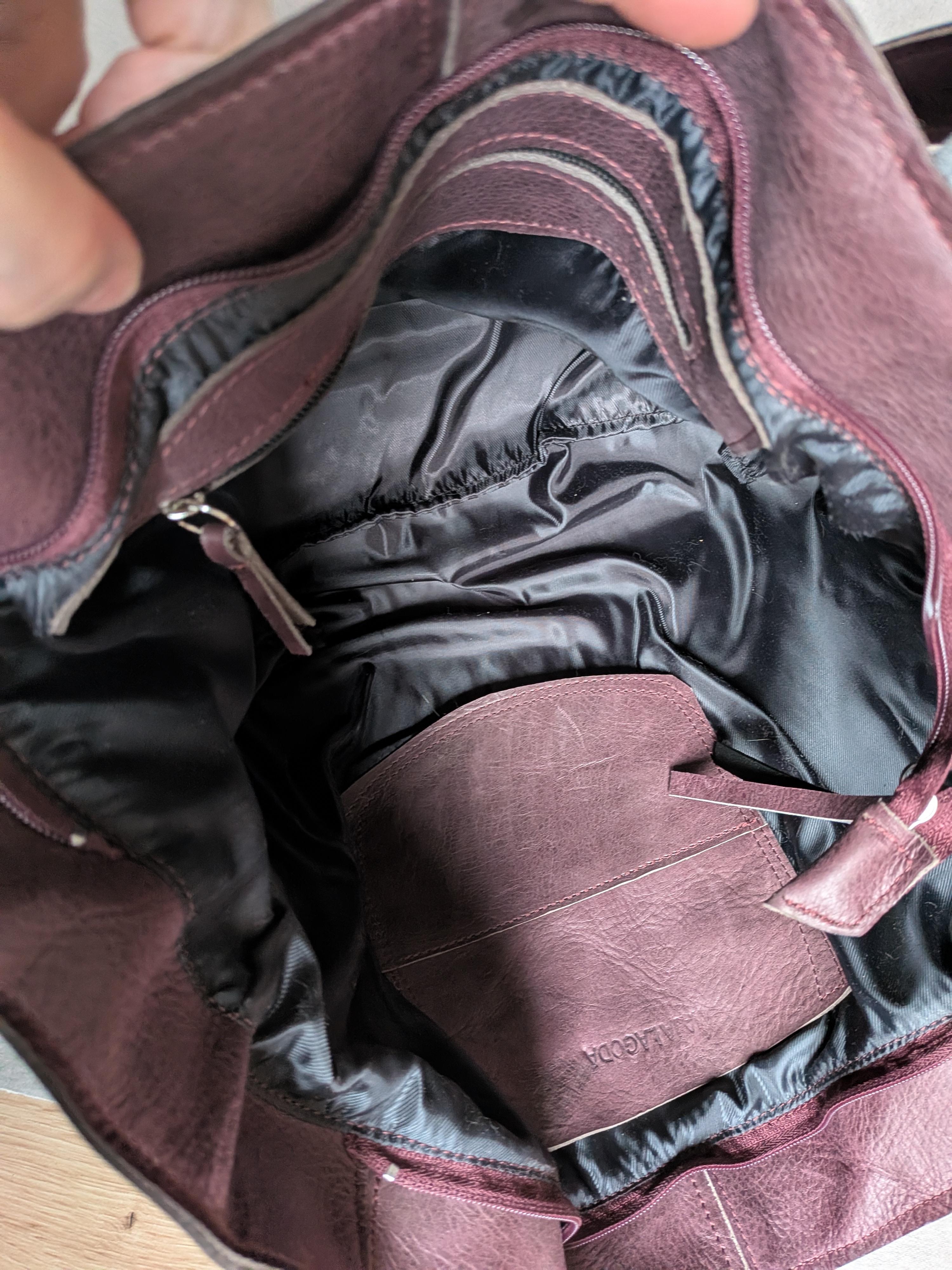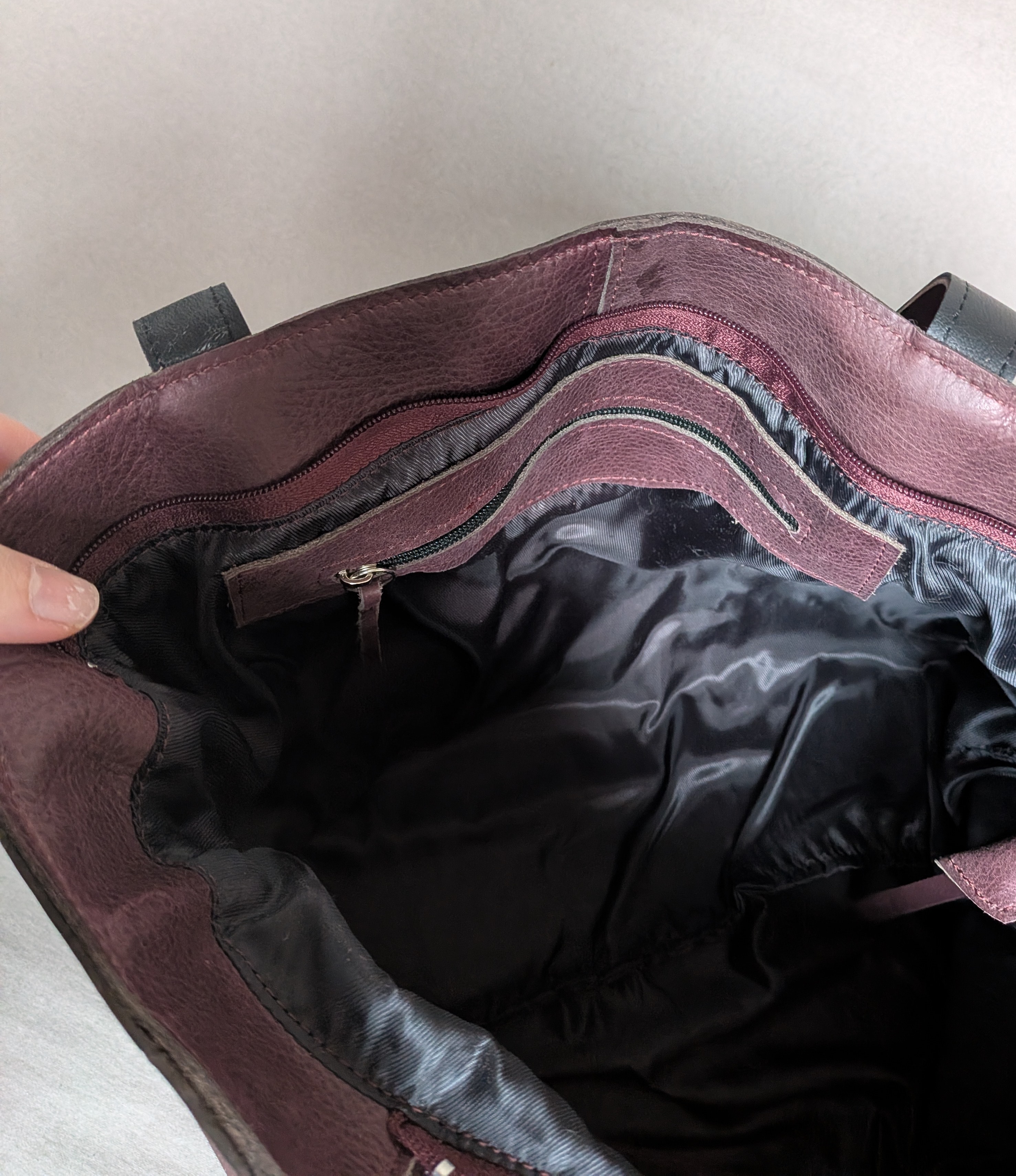 Wewnątrz czarna podszewka, w środku kieszeń zapinana na zamek oraz 1 kieszonka na telefon.