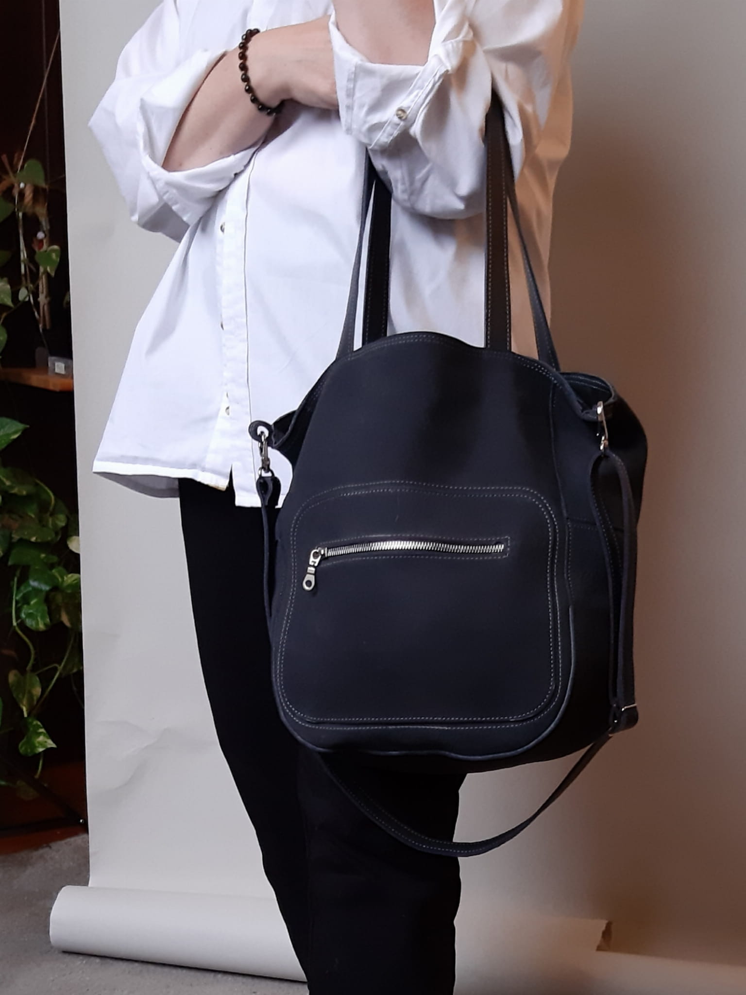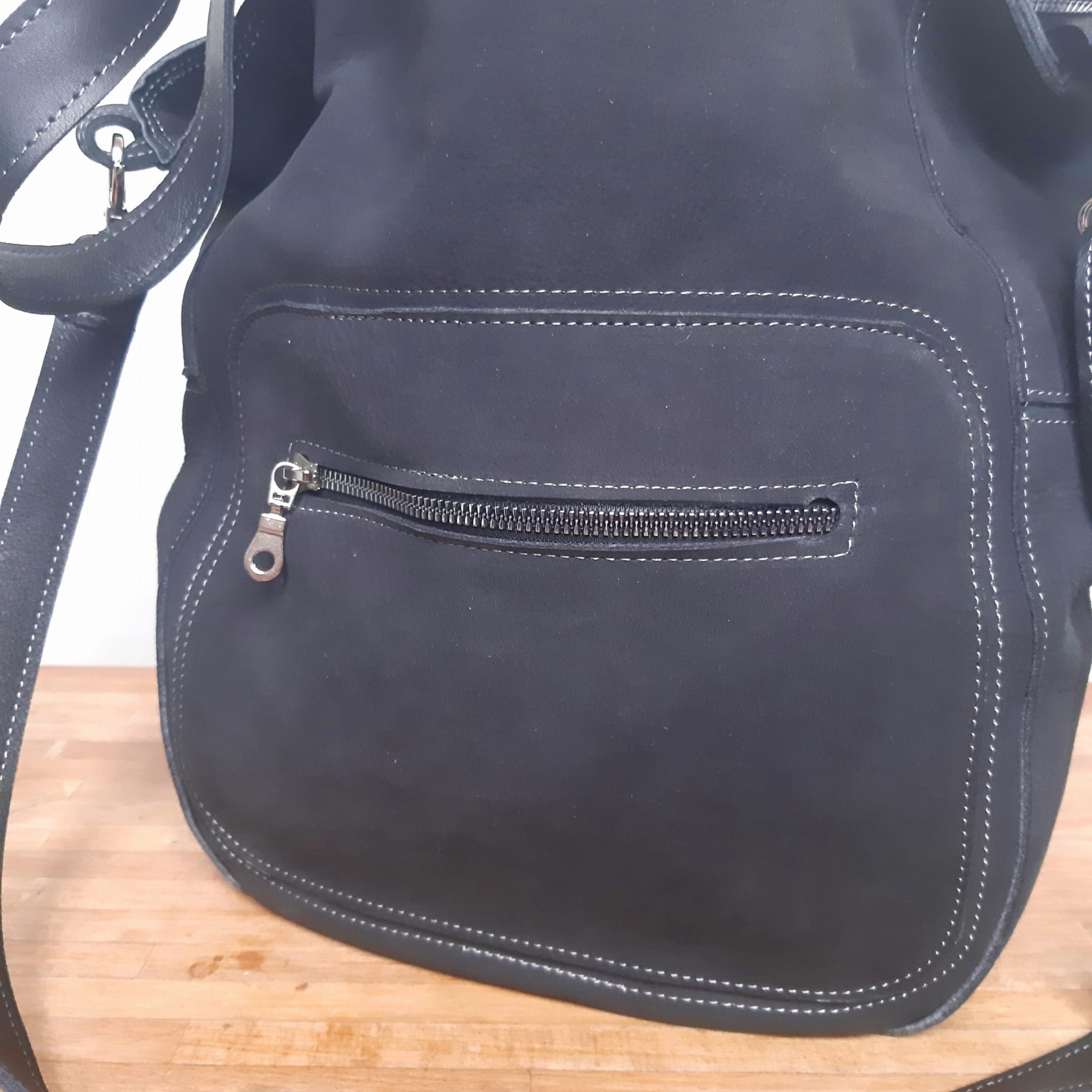 Uszyta z naturalnej skóry nubukowej. Z przodu zewnętrzna kieszeń zapinana na zamek.