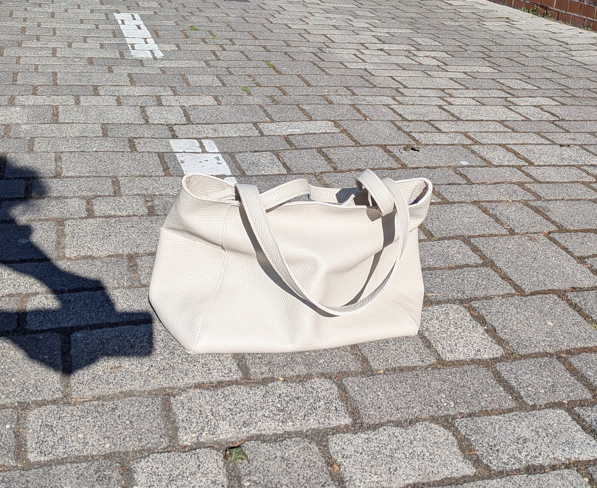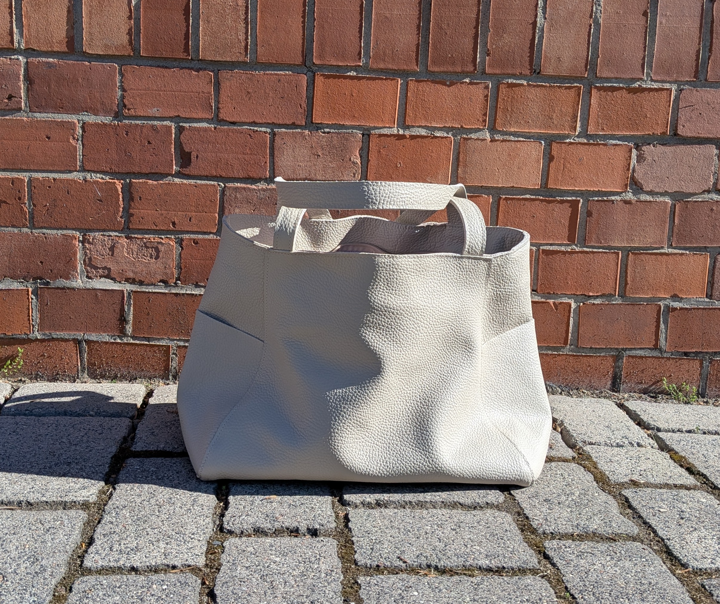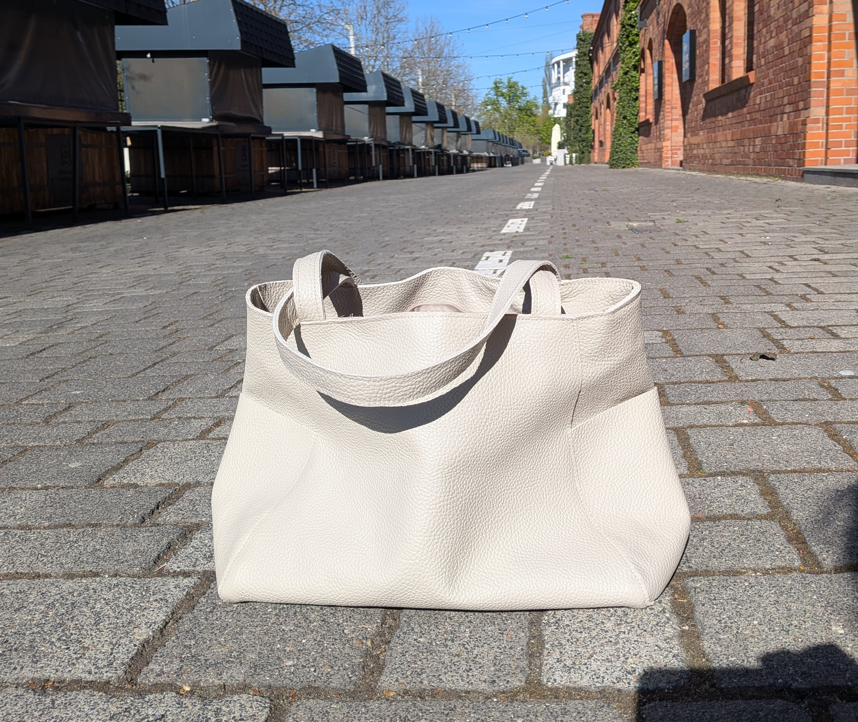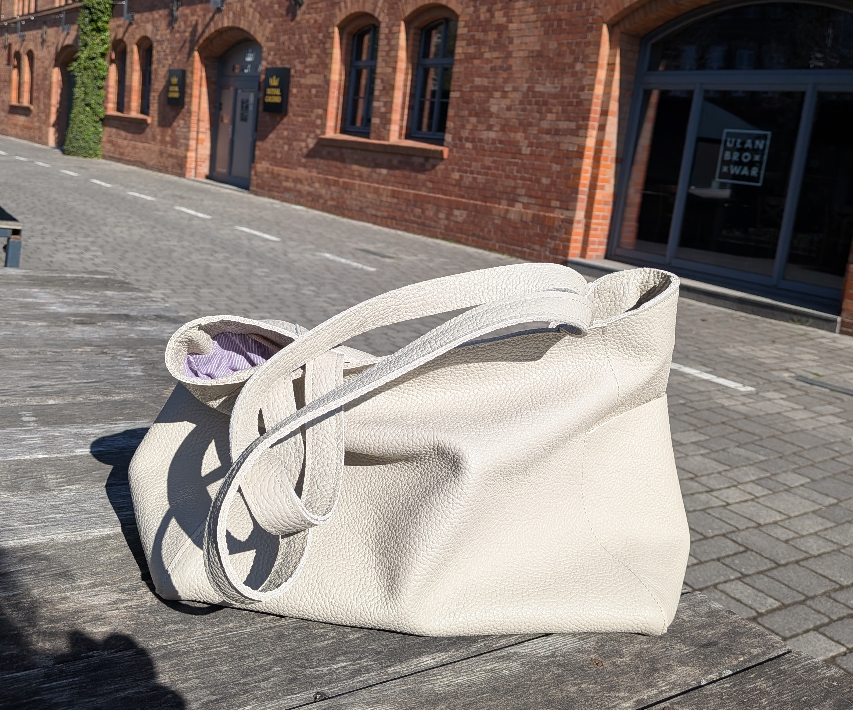 Duża, uszyta ze skóry naturalnej w kolorze jasno beżowym, ze skóry naturalnej z groszkowa fakturą.