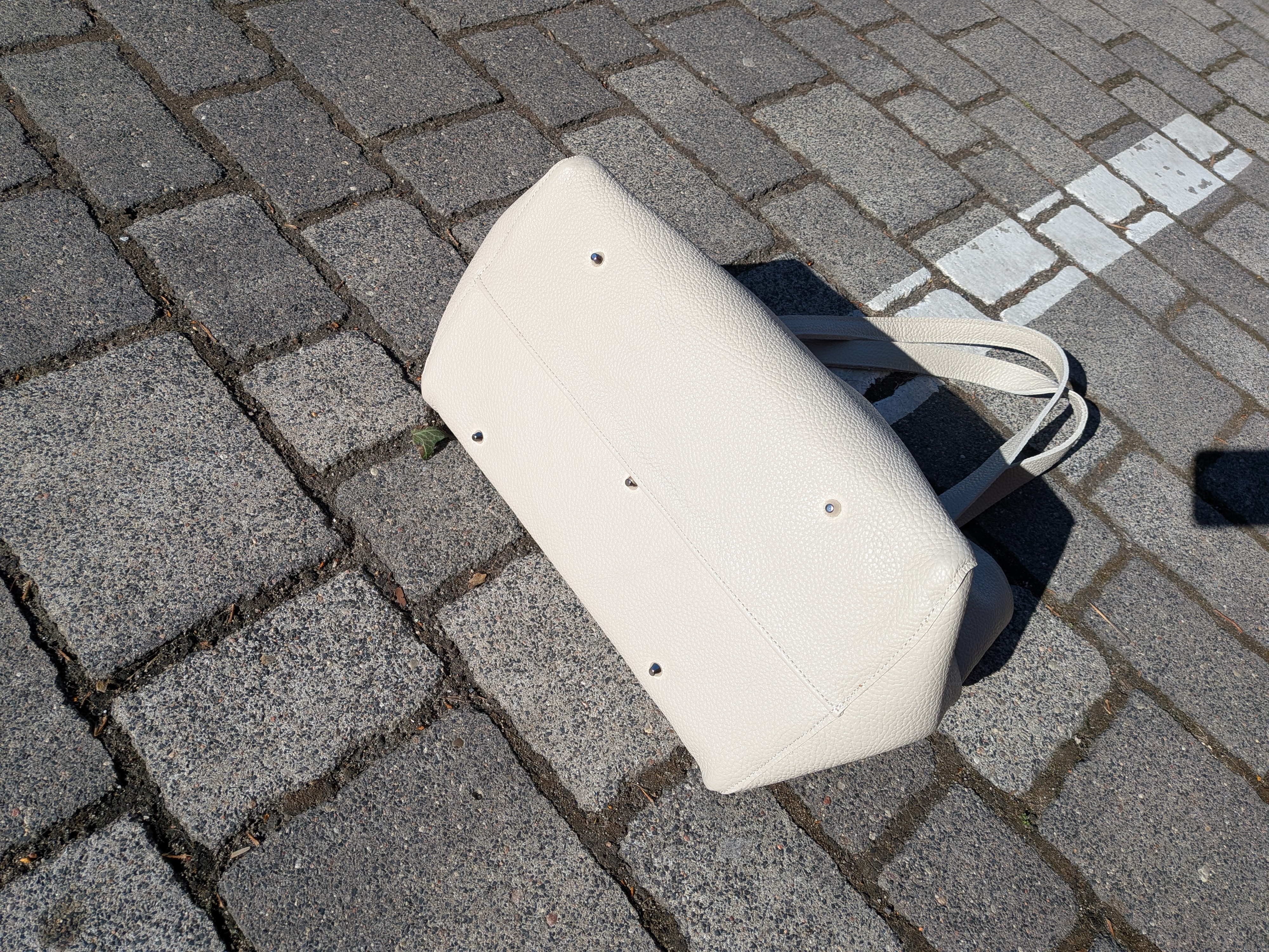 Torba ma fason takiego jakby dużego kuferka. Dno ma szerokie na 18 cm, po bokach wygodne duże kieszenie.