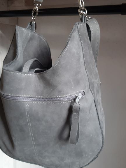 Średniej wielkości owalna torebka ze skóry naturalnej typu nubuk. Trochę w stylu boho, trochę hippie.
