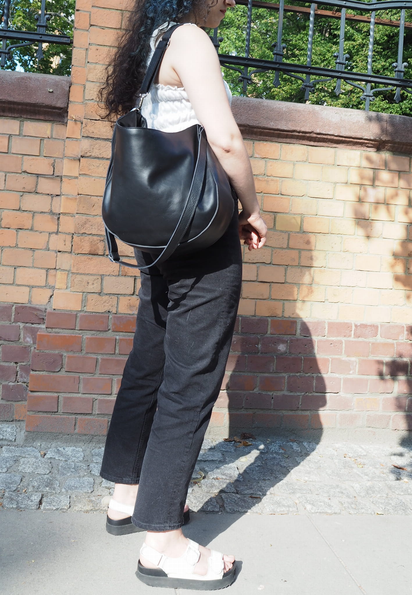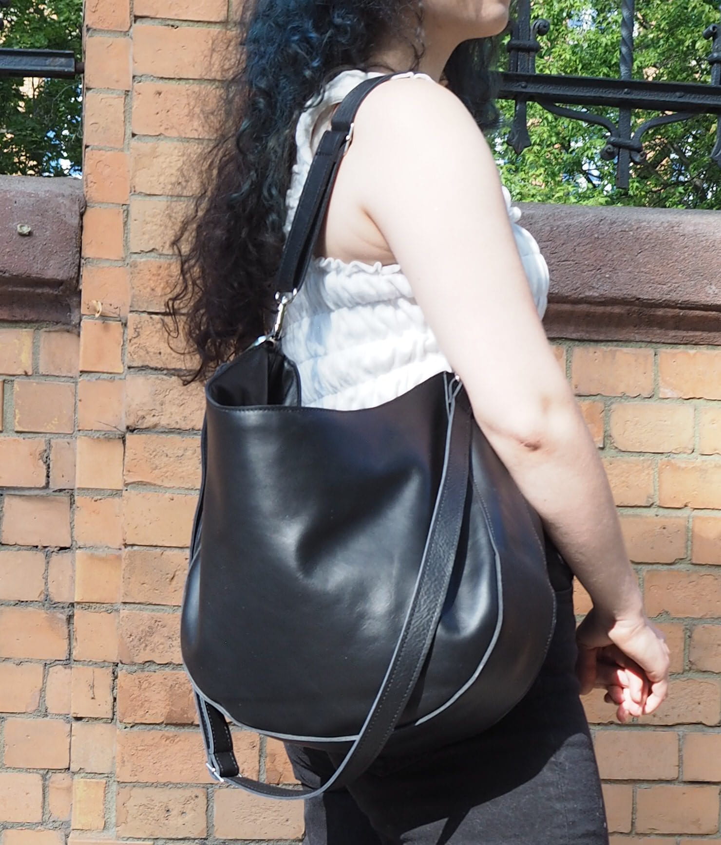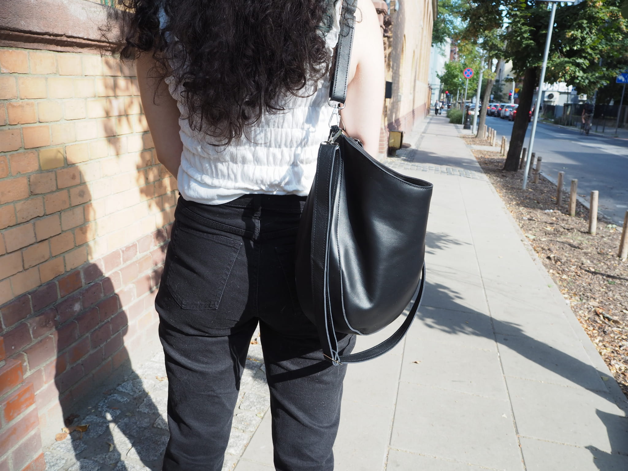 Miękka zaokrąglona torebka w stylu "banana bag". Do noszenia na krótkim pasku ciasno na ramieniu lub na skos na regulowanym. Uszyta z miękkiej czarnej skóry naturalnej. Cudowna na lato i po lecie .