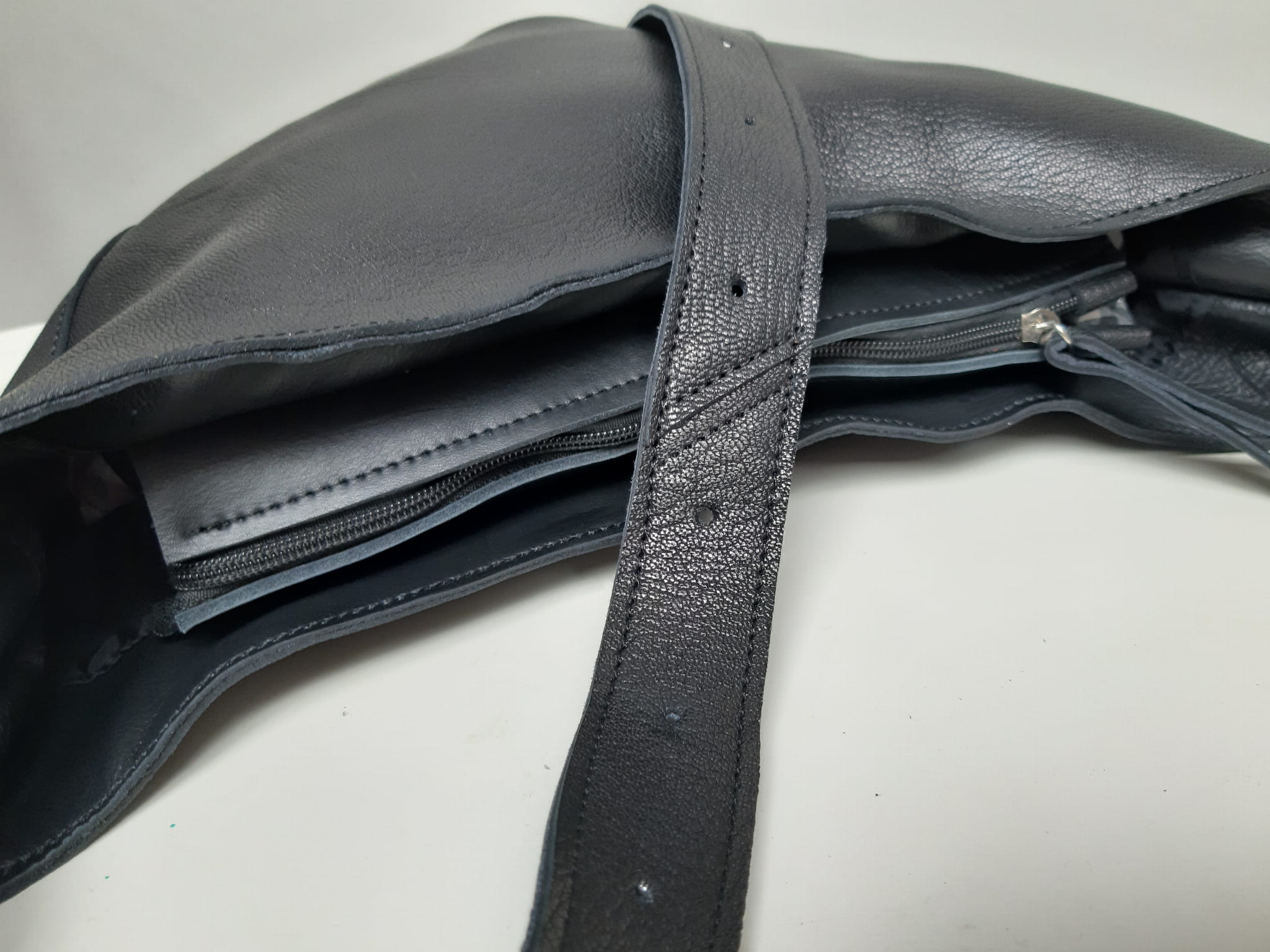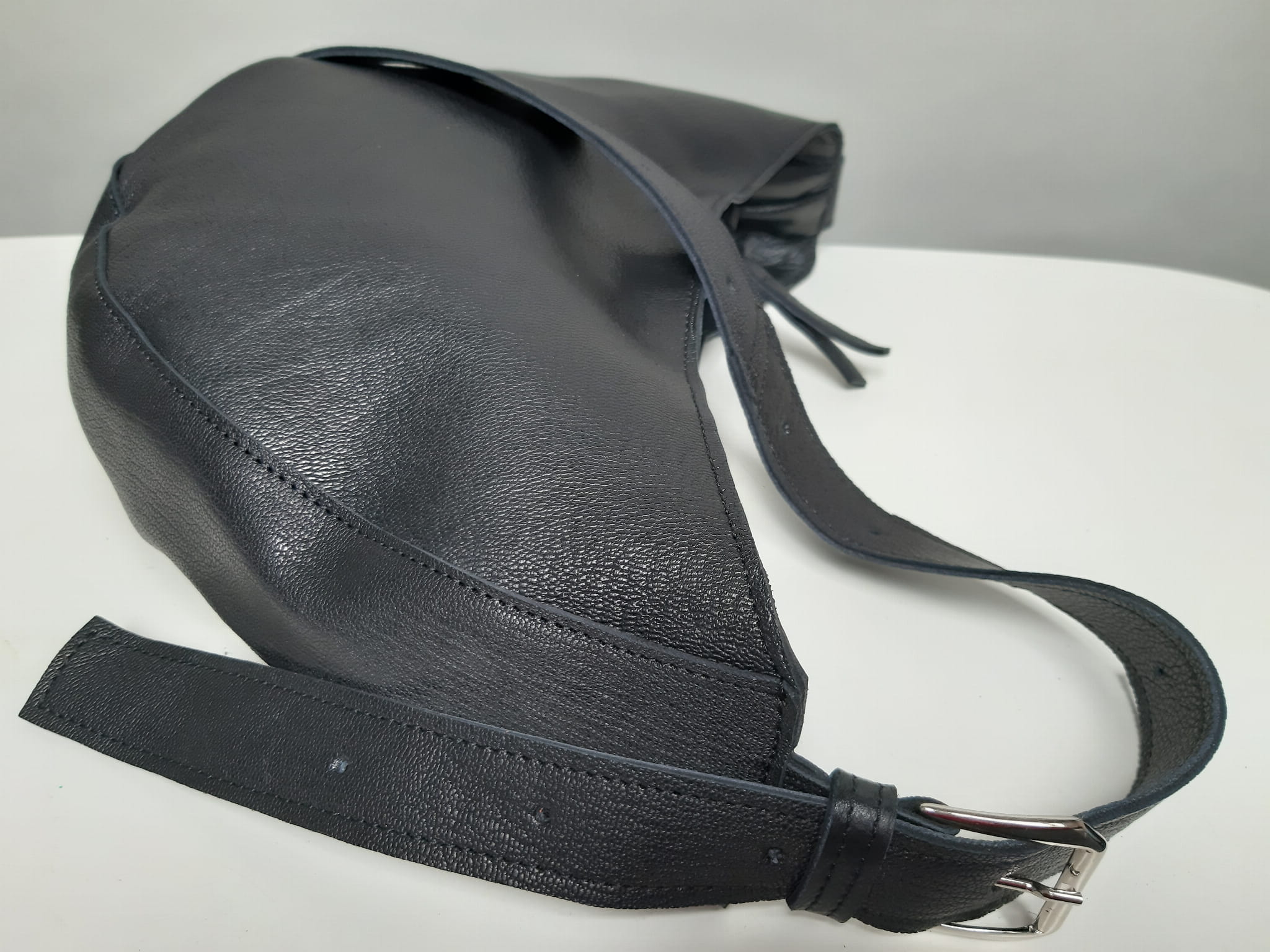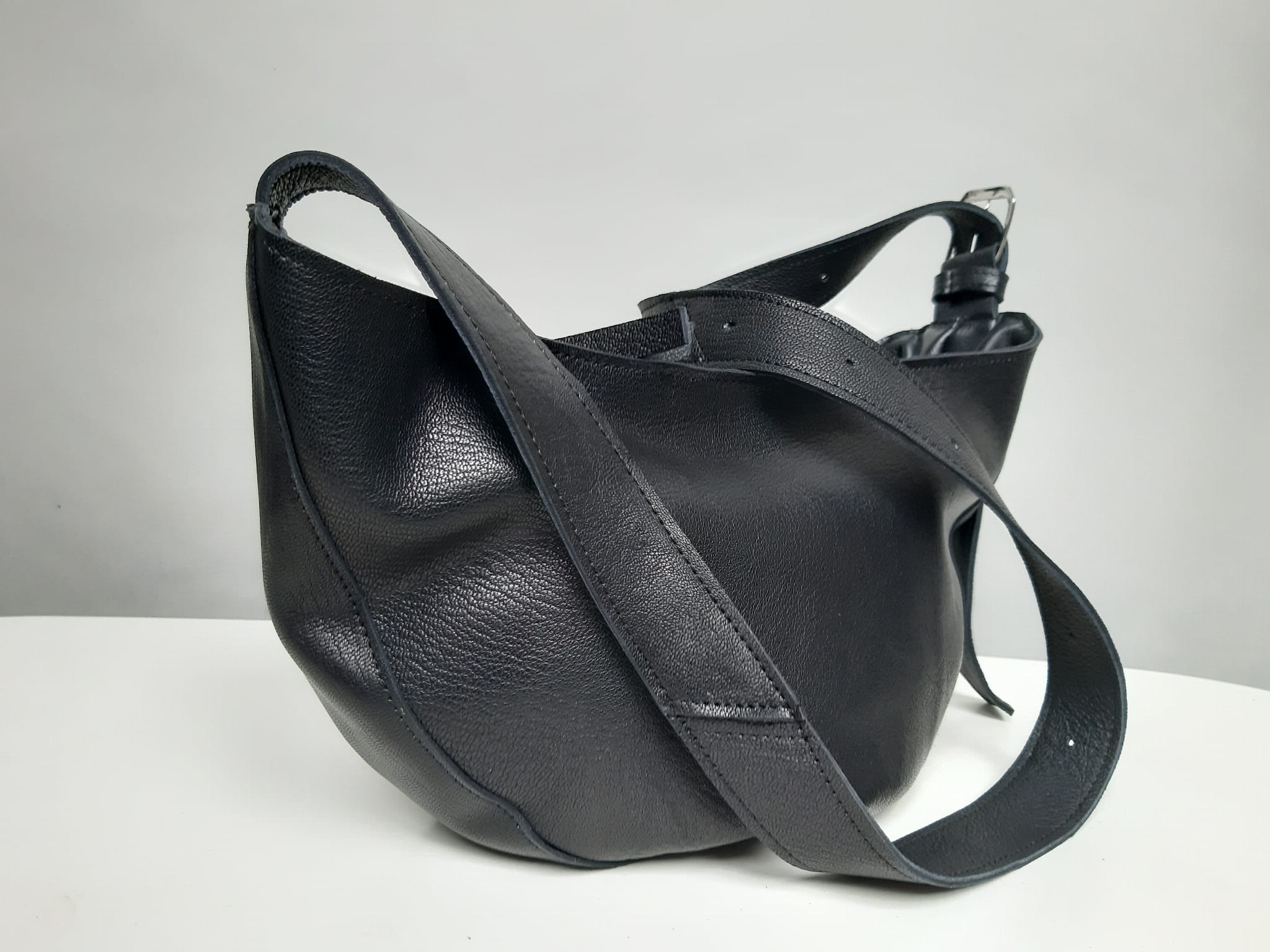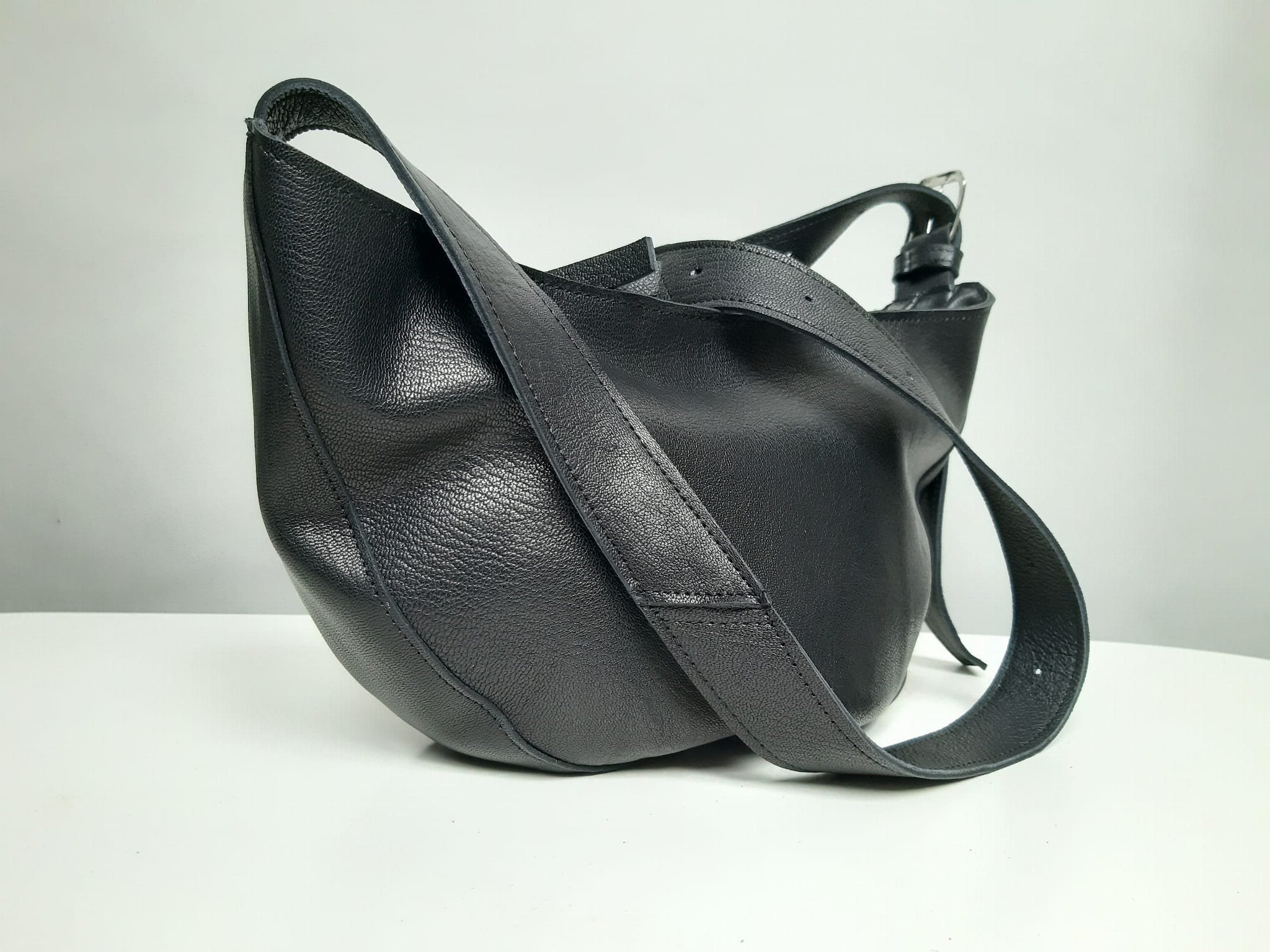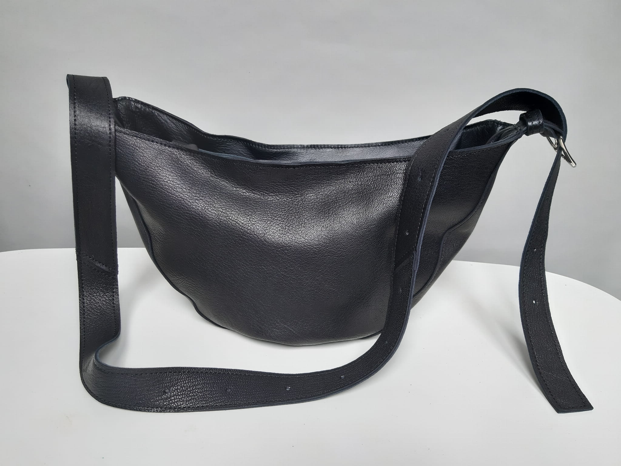 Średniej wielkości torebka typu rogalik. Uszyta z miękkiej mięsistej skóry naturalnej. Skóra miękka, z bardzo delikatną fakturą.