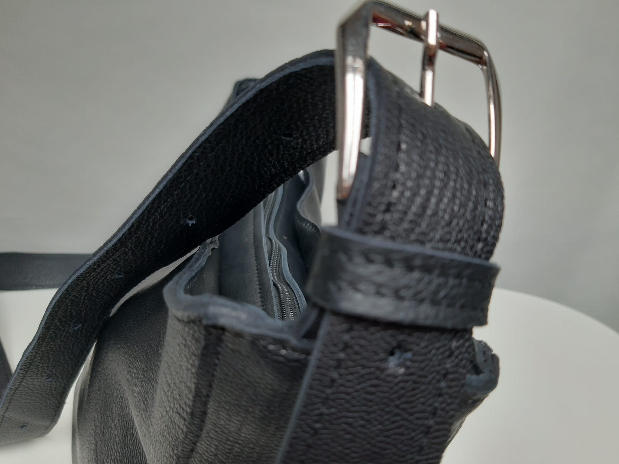 Do noszenia na długim zapinanym na klamerkę pasku. Pasek szer. 3 cm.