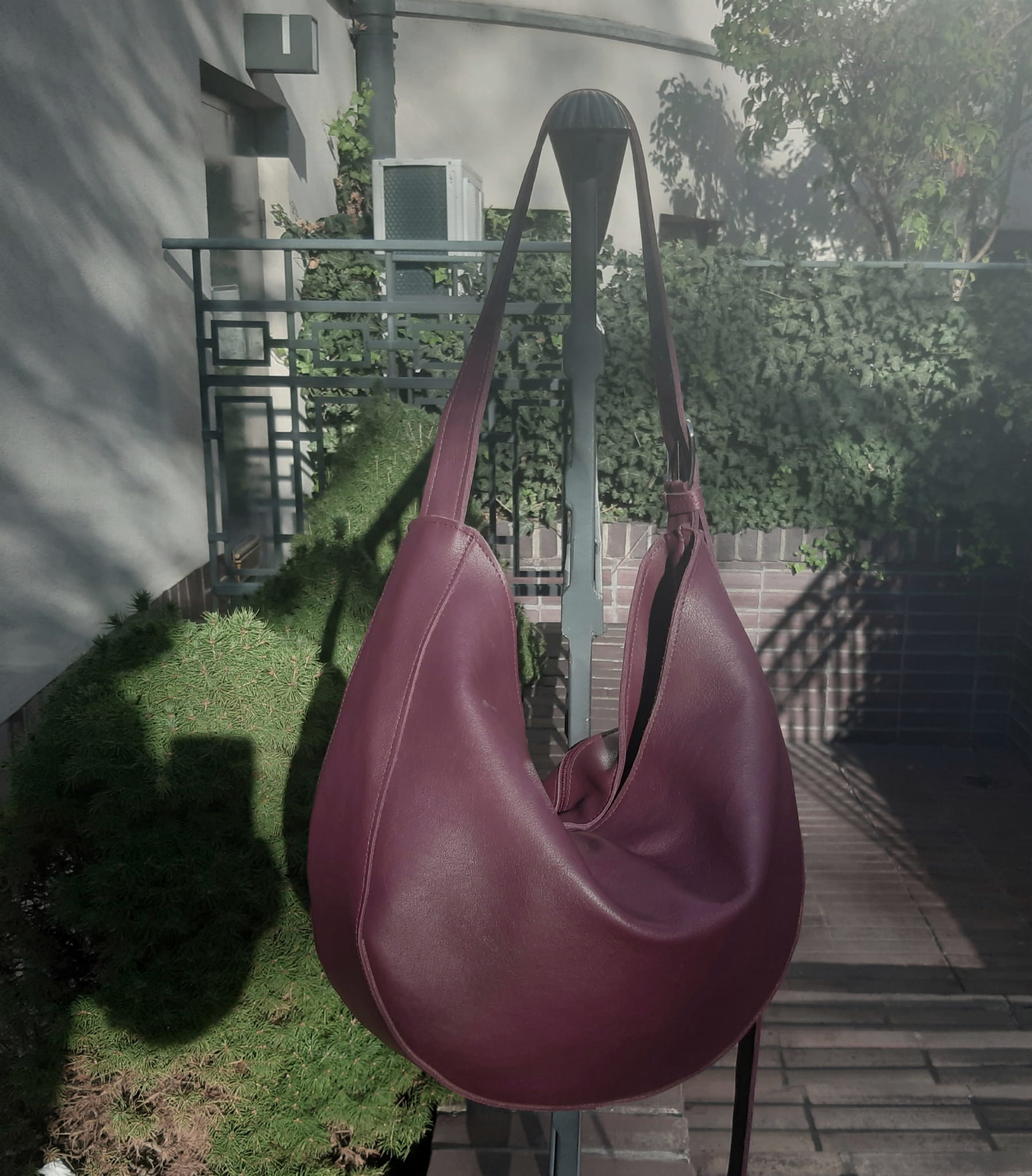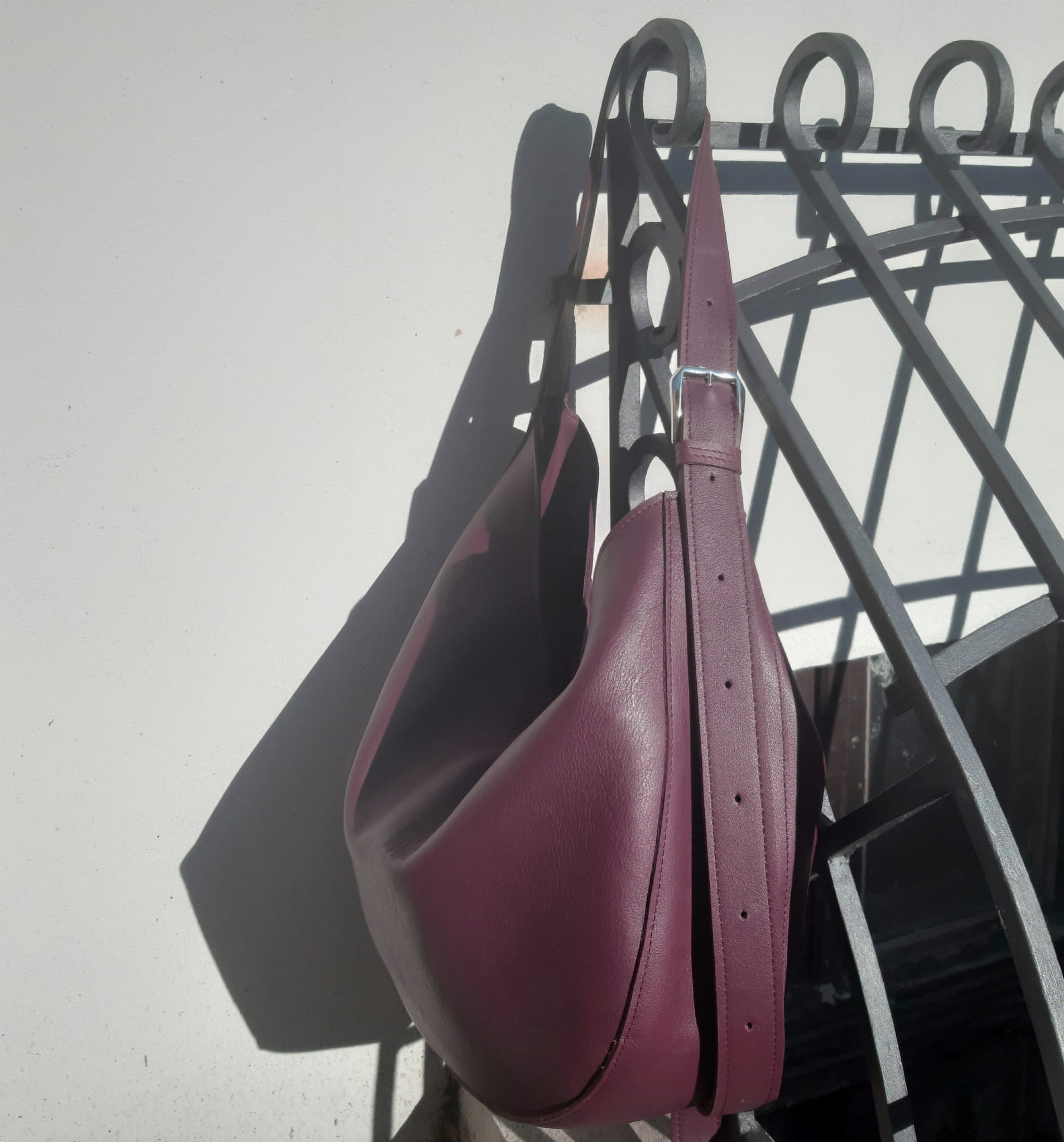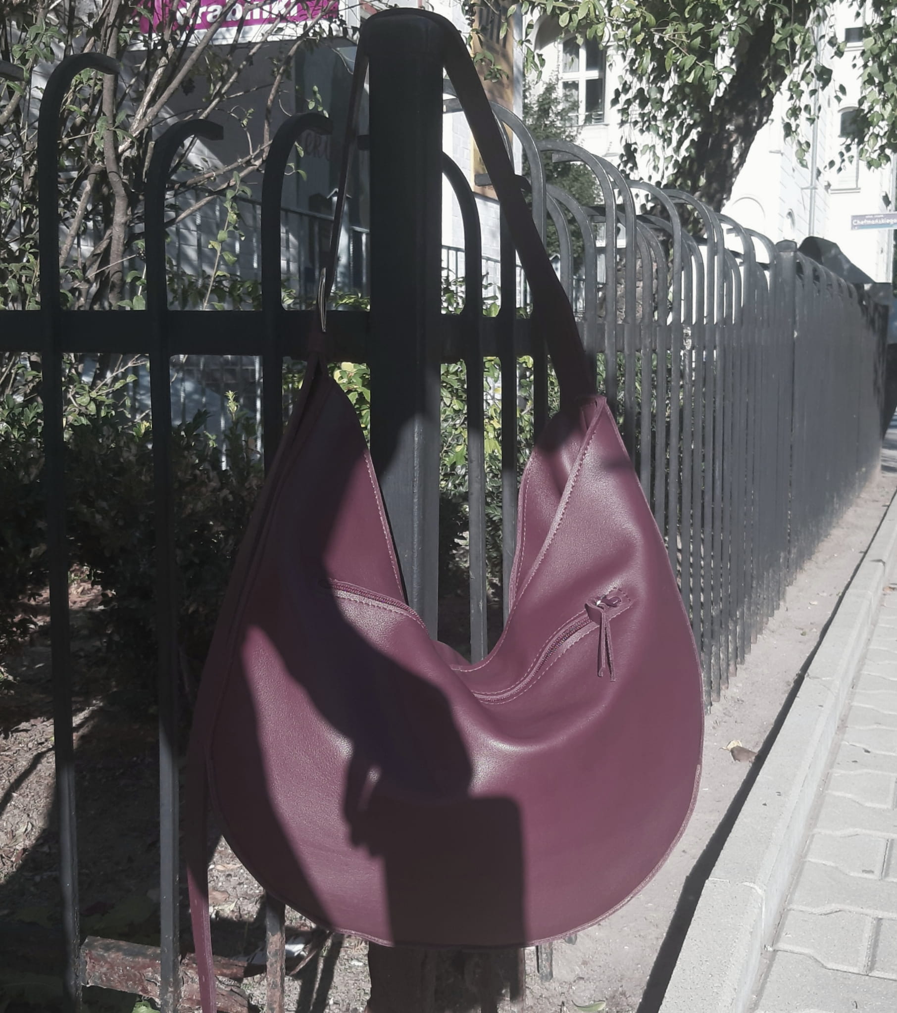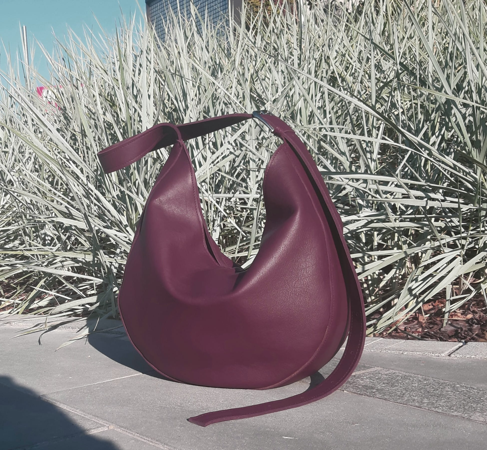 Śliwkowa zaokrąglona miękka torebka na długim pasku