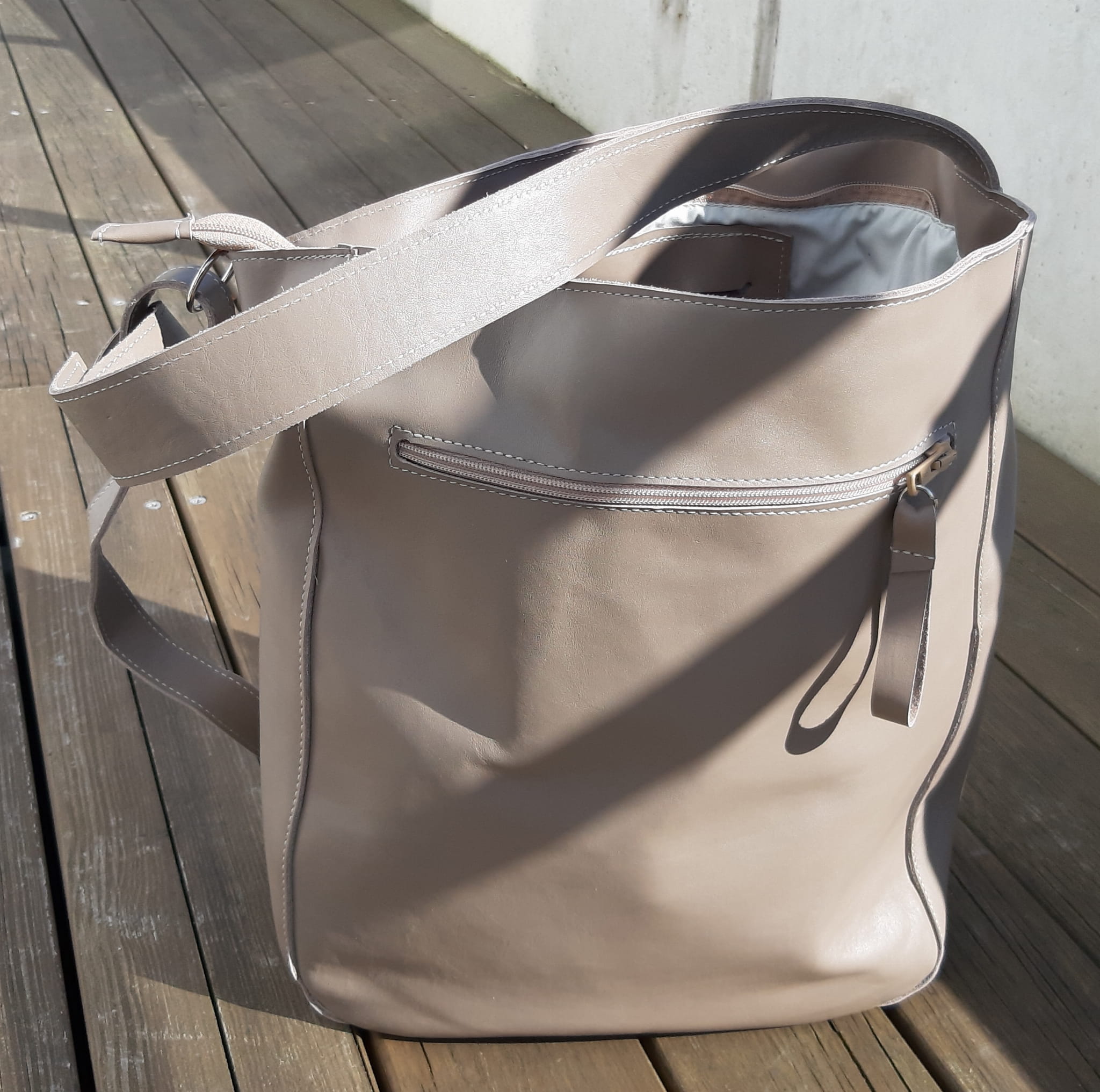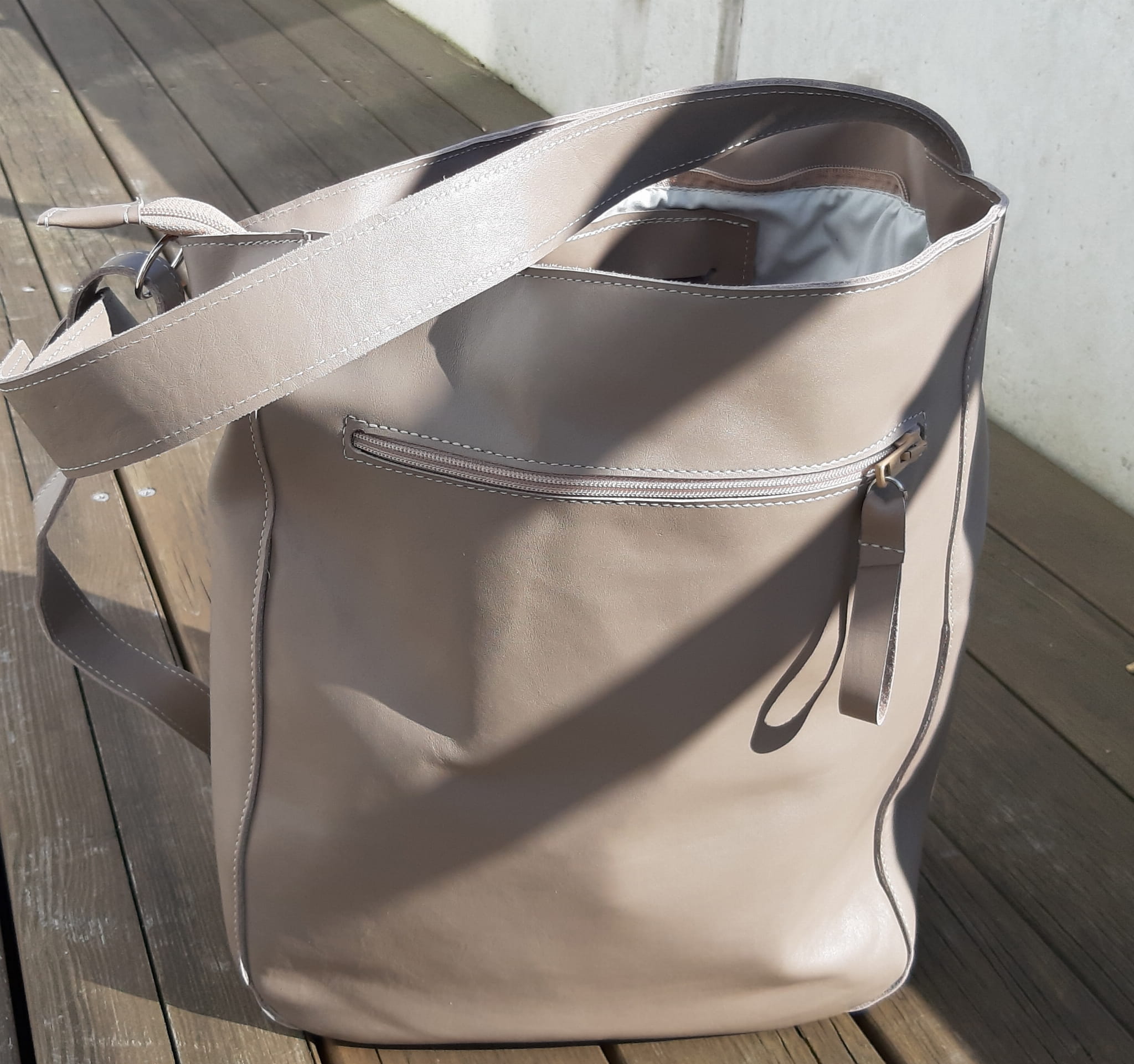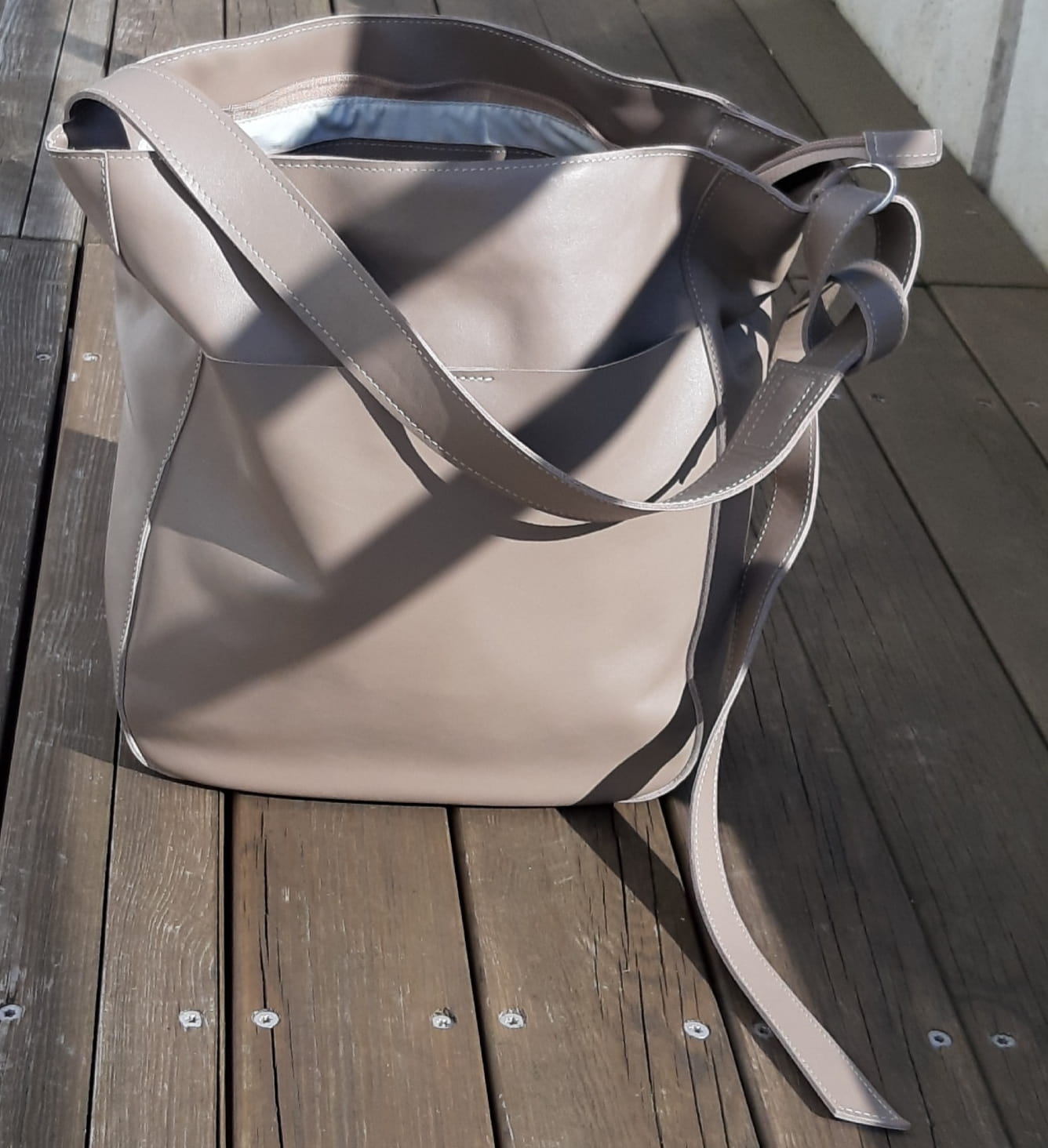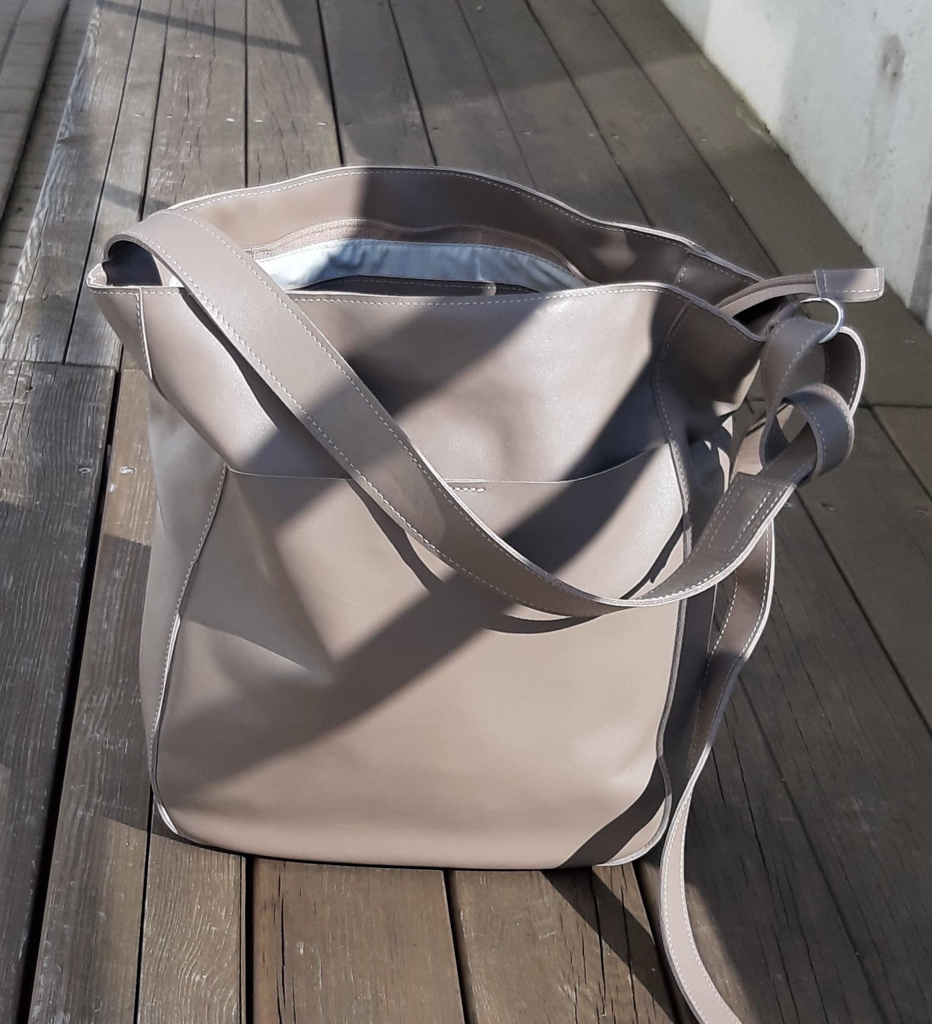Fajny duży miękki skórzany worek. Kolor - beż w odcieniu taupe.